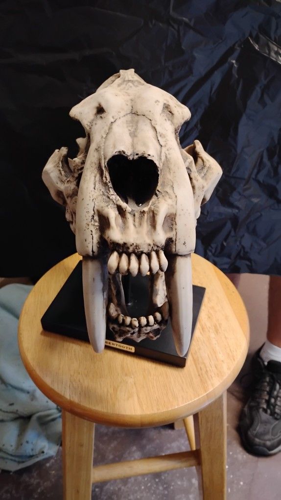 $100 Sabertooth Tiger Cat Fossil Skull Skeleton Replica Statue With Museum Pole Mount • This Sabertooth Fossil Skull Replica Statue measures 12" tall, 11" wide and 6.5" deep approximately. It weighs about 4.25 pounds. • This Sabertooth Fossil Skull Replica Statue is made of high quality polystone, individually handpainted and polished. Because each piece is partially hand crafted, color tone may vary from pictures. The product mount is included with the item and you can display the skull with or without the mount. The base mount comes with a brass name plate that says "Sabertooth". • This aged bone finish fantasy sabertooth skull figurine is a convincing prehistoric tiger fossil replica characterized by long, curved saber-shaped canine teeth which protruded from the mouth even when closed. • Minimal assembly is required for the skull to set on the mount (included). Its quality is museum gallery superb and will be a fine centerpiece for any home!