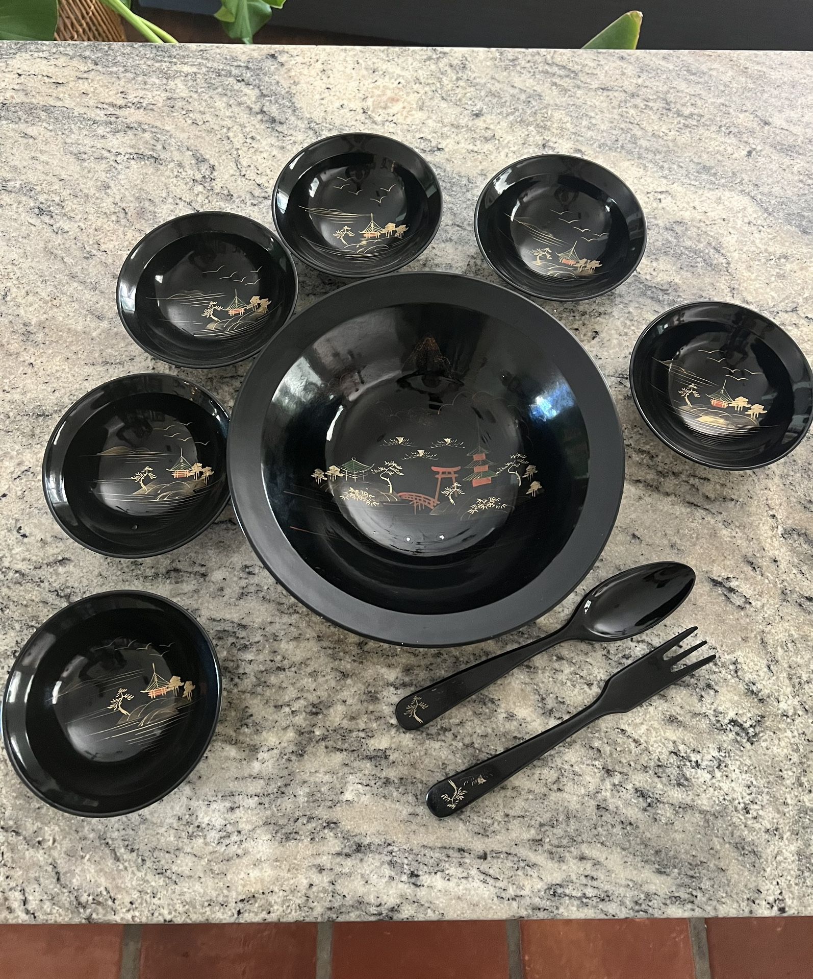 This is a vintage Japanese Aizu black lacquer nine-piece salad serving set. The set includes: One large serving bowl Six individual serving bowls One serving fork and one serving spoon Each piece features hand-painted, gilded scenes often depicting Mt. Fuji and surrounding landscapes. This style of set was popular in the mid-20th century, often marked as "Occupied Japan" era pieces.