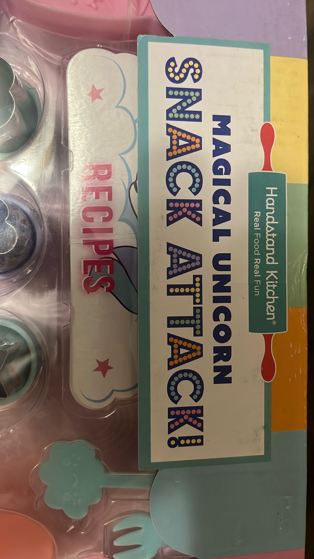 Magical Unicorn Snack Attack is a Handstand Kitchen - Real Food Real Fun. Make lunch or snack time a magical time. Includes 1 unicorn cutting mat, 1 child-safe serrated knife, 1 spatula, 1 silicone snack mold & more. Food ingredients not included.