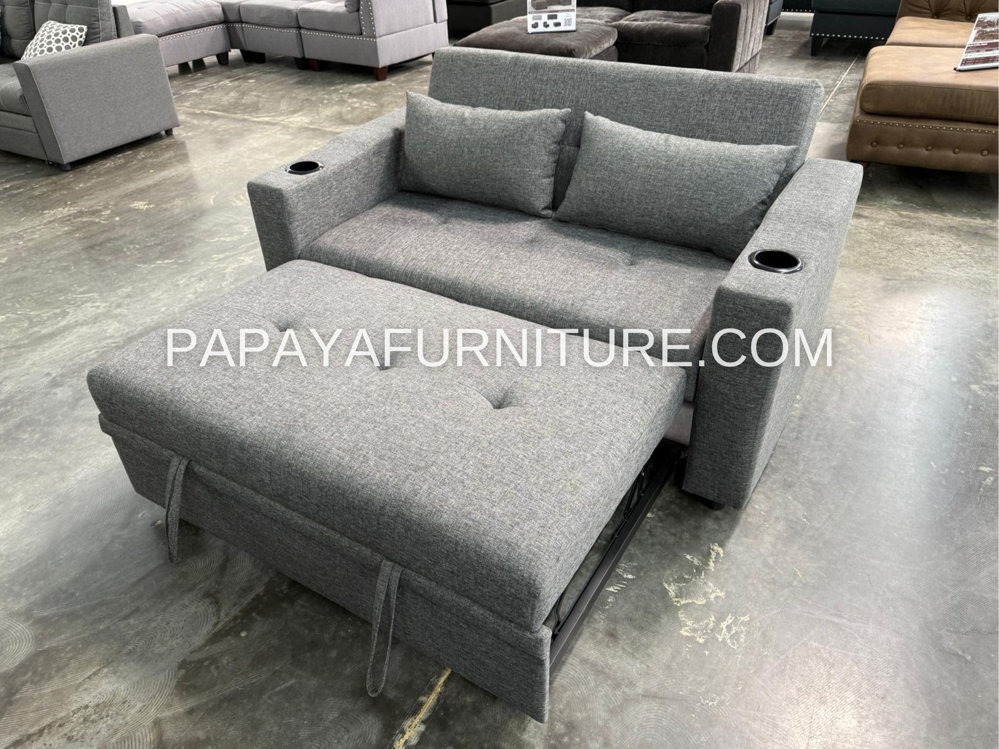 New! Square Arm Convertible Sofa, Grey Sofa Bed, Sofabed, Sofa bed with cupholders, Dark Gray Sleeper Sofa, Couch, Sleeper Sofa Bed Dimensions: Sofa: 59" x 34" x 33" H Sofa (up) w/pull-out bed: 59" x 61" x 33" H Sofa (flat) w/pull-out bed: 59" x 70" x 26" H Materials: Polyester (Linen-like Fabric) SKU:F8534