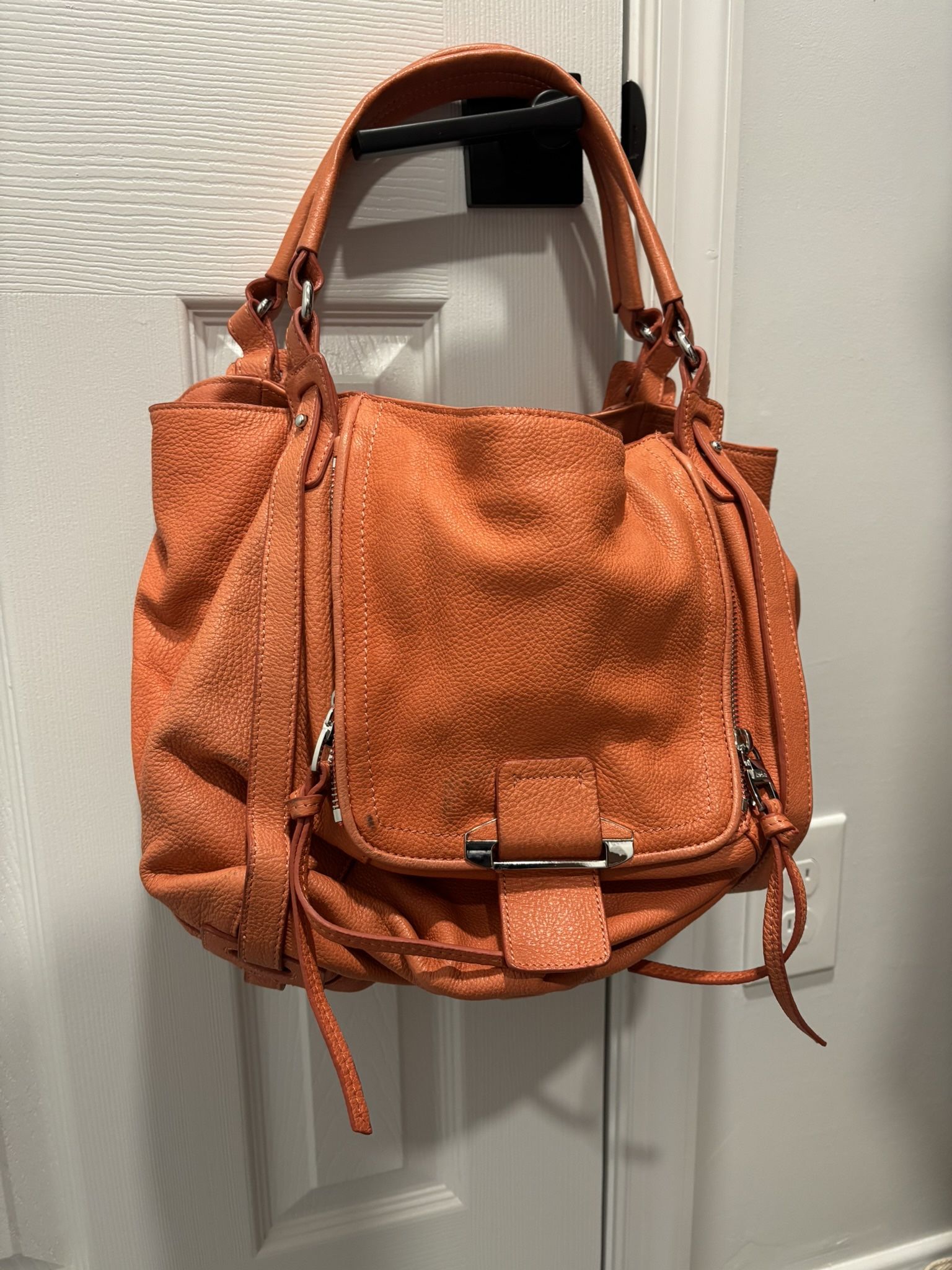 Stylish and vibrant tangerine leather shoulder bag, perfect for any occasion. Add a pop of color to your outfit with this chic accessory. Never used (scuff tag protector still on), but small scuff marks from being moved over the years. Comes with authenticity card.