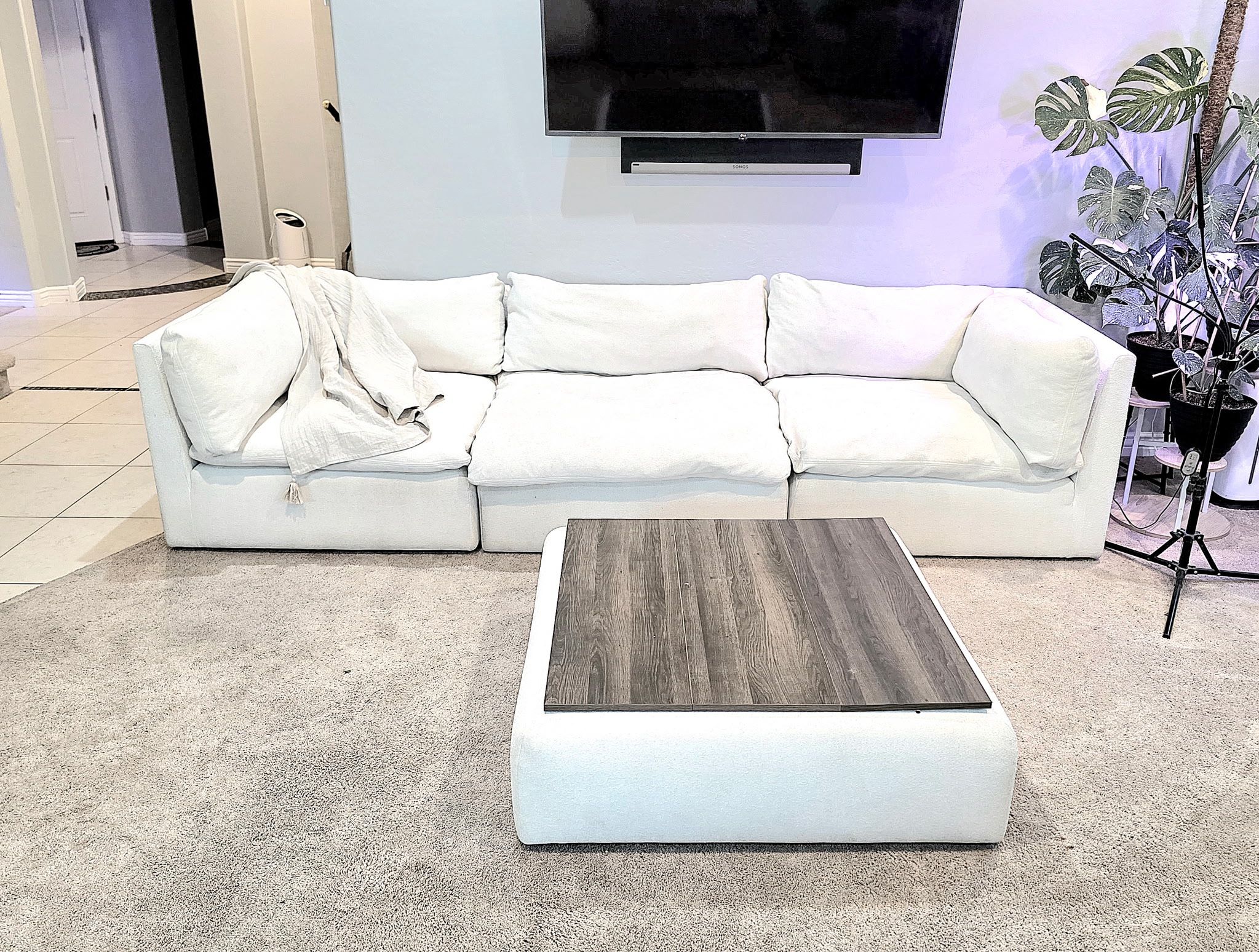Selling our Cloud Couch “Paloma” Modular Sectional in a soft white/ivory. Couch is your classic all down filled sectional. All covers are removable for an easy washing. Sectional includes the converted wood table top ottoman for extra functionality. Measures 120" long × 40" deep × 27" tall (height not including pillows). Ottoman measures 40" × 40" Well cared for. Pet free and smoke free home. Just professionally cleaned. Original retail $2900 Please feel free to reach out with any questions. Can deliver for a fair fee. 😊