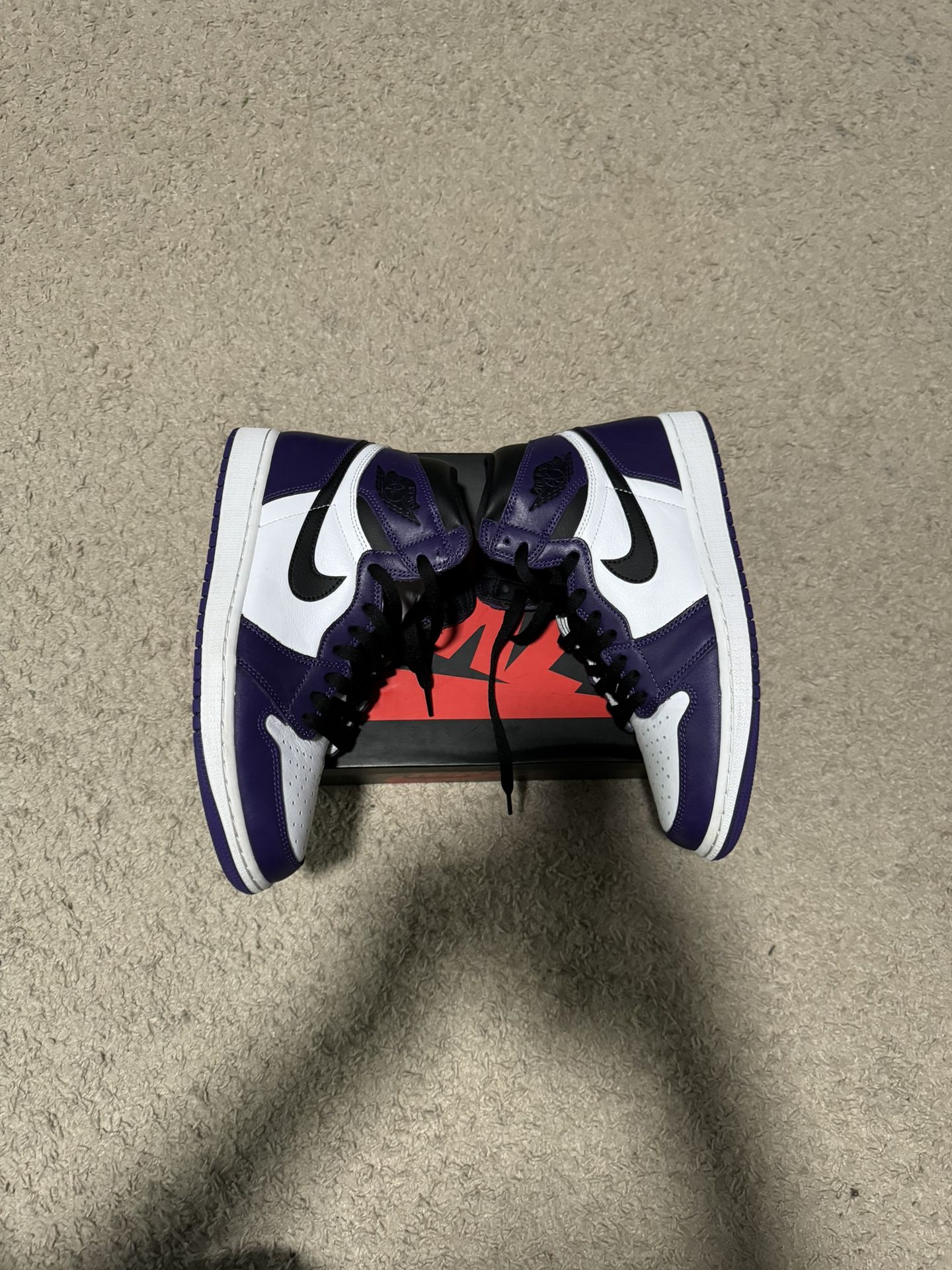 Jordan 1 high court purple 2.0's size 9.5. Barely any star loss and barely any heel drag a little creasing. 9.5/10 condition. Comes with box and extra laces. Want 100 obo