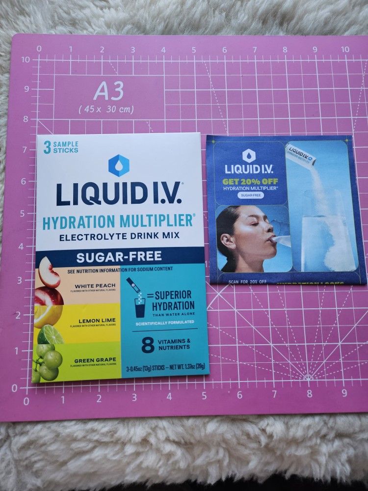 3- 0.45oz/13g sample sticks of LIQUID I.V. HYDRATION MULTIPLIER ELECTROLYTE DRINK MIX, SUGAR-FREE contains 8 VITAMINS & NUTRIENTS ONE STICK = SUPERIOR HYDRATION THAN WATER ALONE SCIENTIFICALLY FORMULATED. FLAVORS ARE WHITE PEACH, LEMON, & GREEN GRAPE. BEST IF USED BY: 03 April 2027. Sample sticks come in manufactures Sealed envelope and comes with a 20% off purchase coupon if you decide to buy a full box. ☆ Free if picked up, no holds first who’s able to pick up gets it. Stored in cool temperature-controlled room, away from direct sunlight in a Clean, Smoke-Free and Pet-Free home.