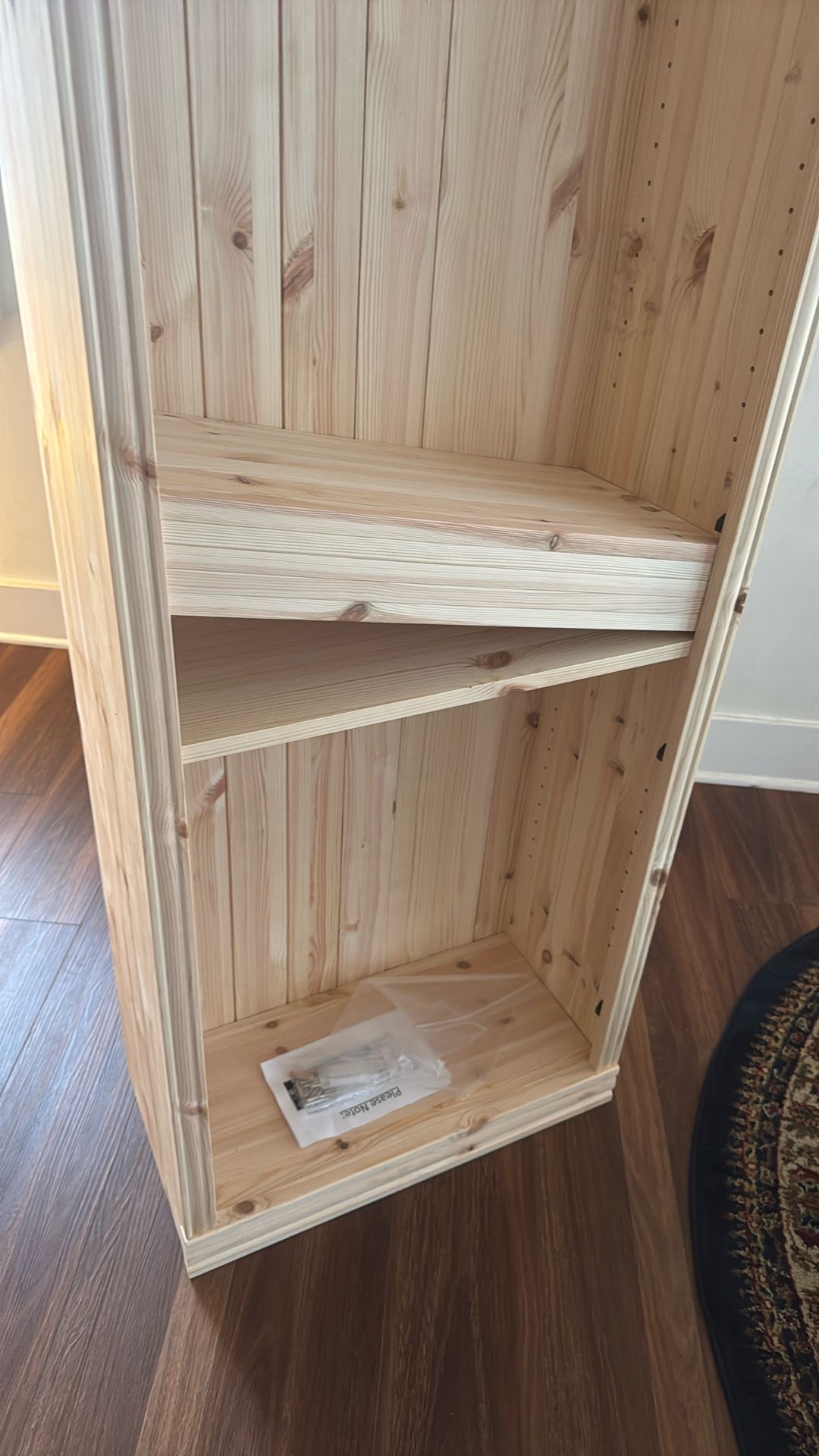 Beautiful solid wood bookcase, brand new / never used, just assembled. Clean, sturdy, and very well made. Specs: • 82” high x 24” wide x 12” deep • Made from 100% real Nordic pine (Finland) • Solid wood construction (not MDF or particle board) • Classic trim mouldings • 5 adjustable shelves + 1 fixed middle shelf • Thick tongue-and-groove wood backing • Smooth, unfinished natural wood (can be left natural or painted/stained) Very strong, tall, and slim profile — great for books, records, collectibles, or storage without taking up much floor space. Condition is like new. No damage, no wobble. Pickup only. Message me if interested.