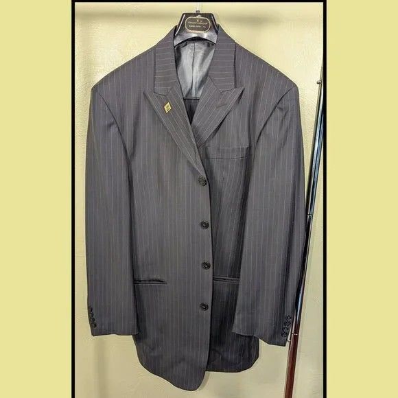 Stacy Adams Men's Suit Color: Grey with light blue stripes Material: 100% Wool Waist 33 Outer seem 40 Inner seem 29 Hips 40