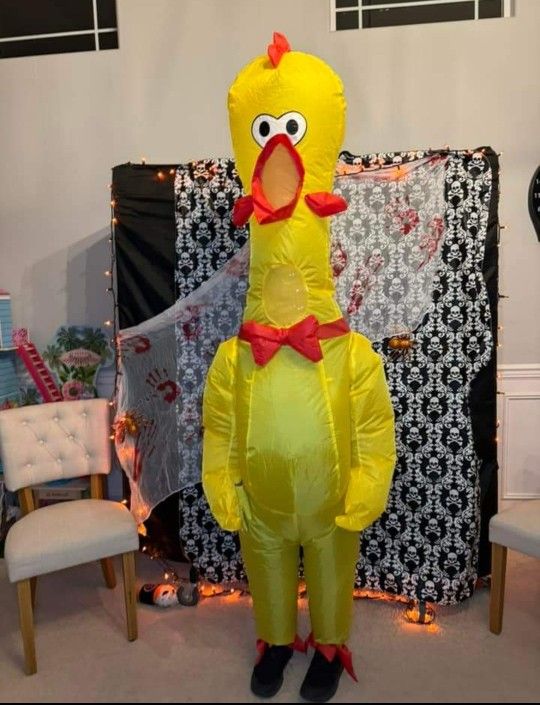 Inflatable rubber chicken costume includes; Inflatable costume, gloves, battery operated fan, belt clip, battery pack (batteries not included) Size: child, one size fits most Porch pickup or meet near Mill Creek area.