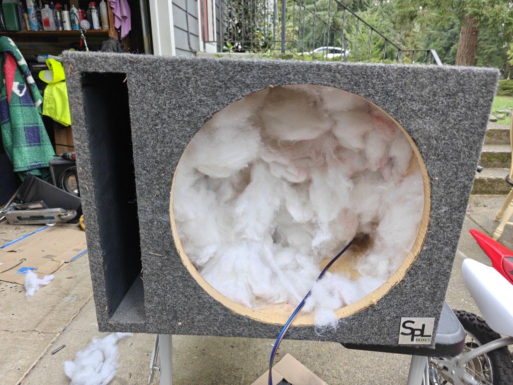 15" ported subwoofer enclosure. Brand new terminal, wired and ready to go. Also has polyfil to trick the sub into thinking it's in a bigger big.
