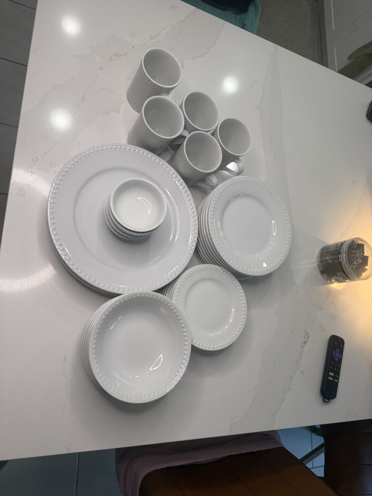 White China set with four large plates, six saucers, six bowls, six tea cup tea plates and six bowls. There’s also six tea cups and five little ramekins. . But a great price at the low price of $80