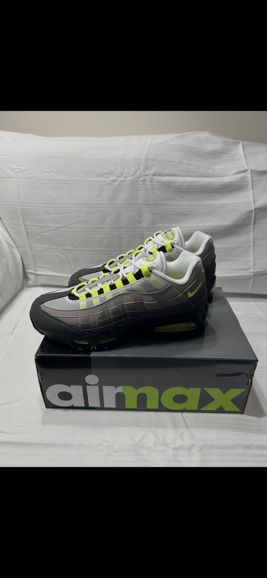 Hello im here today selling these brand new Nike Airmax 95 neon green sneakers(2026) size 9.5! Comes with original box. Has that classic cool grey, black, and neon green (volt) combo. I have different sizes, 7, 9.5, 10, 10.5, 11, 11.5, 12!!! Few left selling out fast! Authentic contact me for the size asap!!!