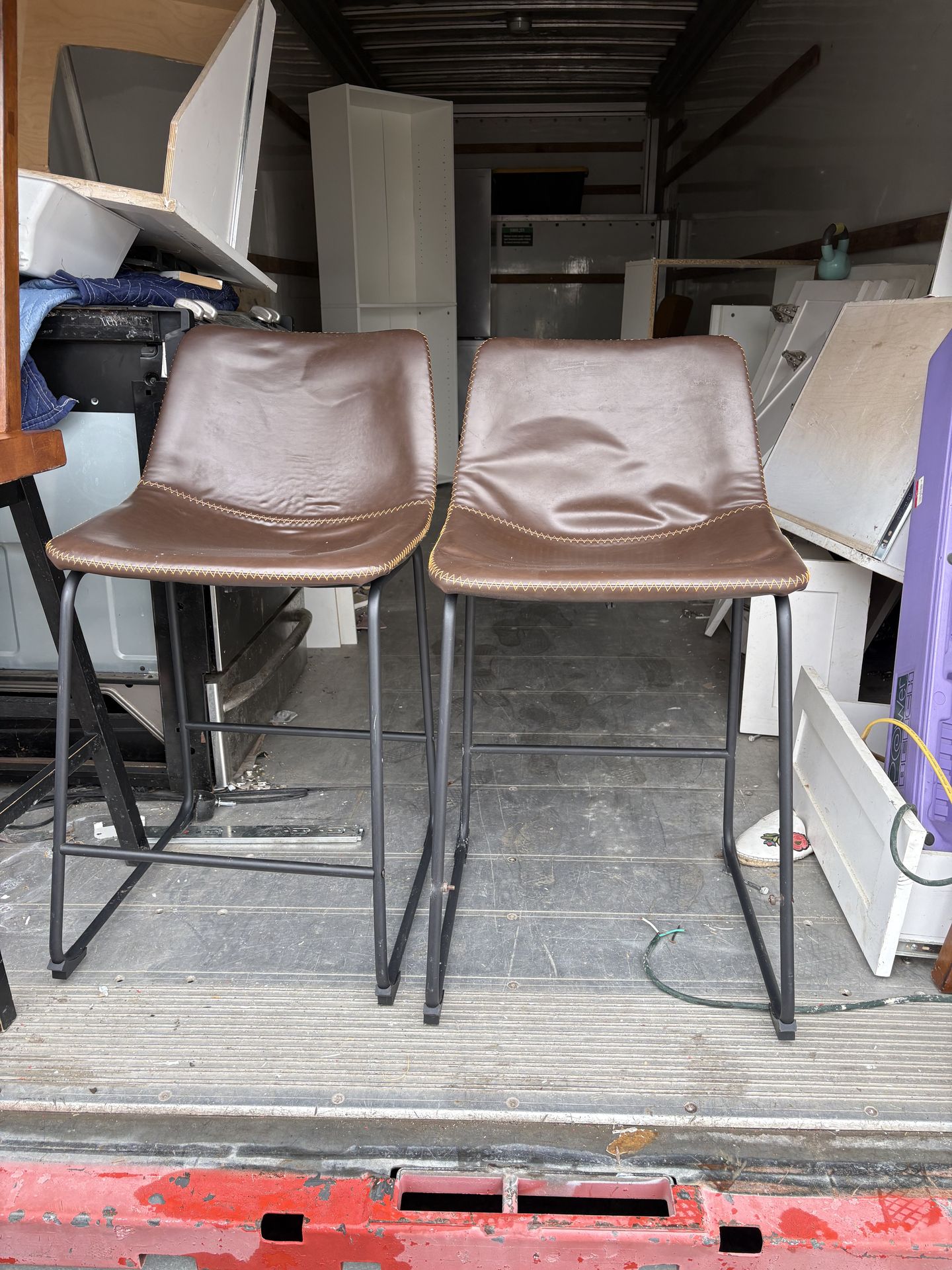Set of Brown Bar Stools w/ Orange Stitching