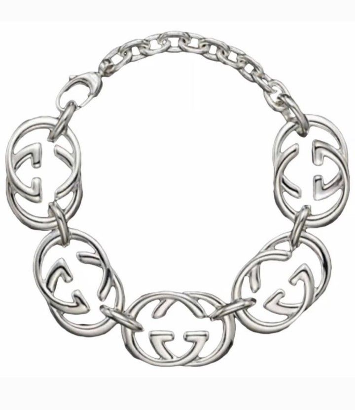 Enjoy the everlasting style of Gucci with the Gucci Britt Sterling Silver Interlocking GG Bracelet - crafted of sterling silver featuring an ornate link chain. This is a chic bracelet with the edgy style, only from Gucci! • Five interlocking GG links • Lobster claw clasp • Hallmark: Ag 925, Sterling silver • Circumference: 8”; Width 5/8 in • Includes Gucci booklet, Gucci pouch & Gucci gift box • Original Retail Price: $700.00