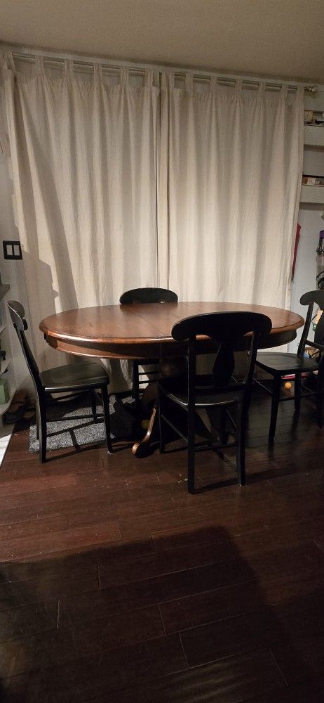 Lightly used, always with a table cover. Bought as from a furniture stager. 32" tall. Removable leaf is 17". Length is about 62" with leaf, 45" without (becomes a circle). Width is 45".