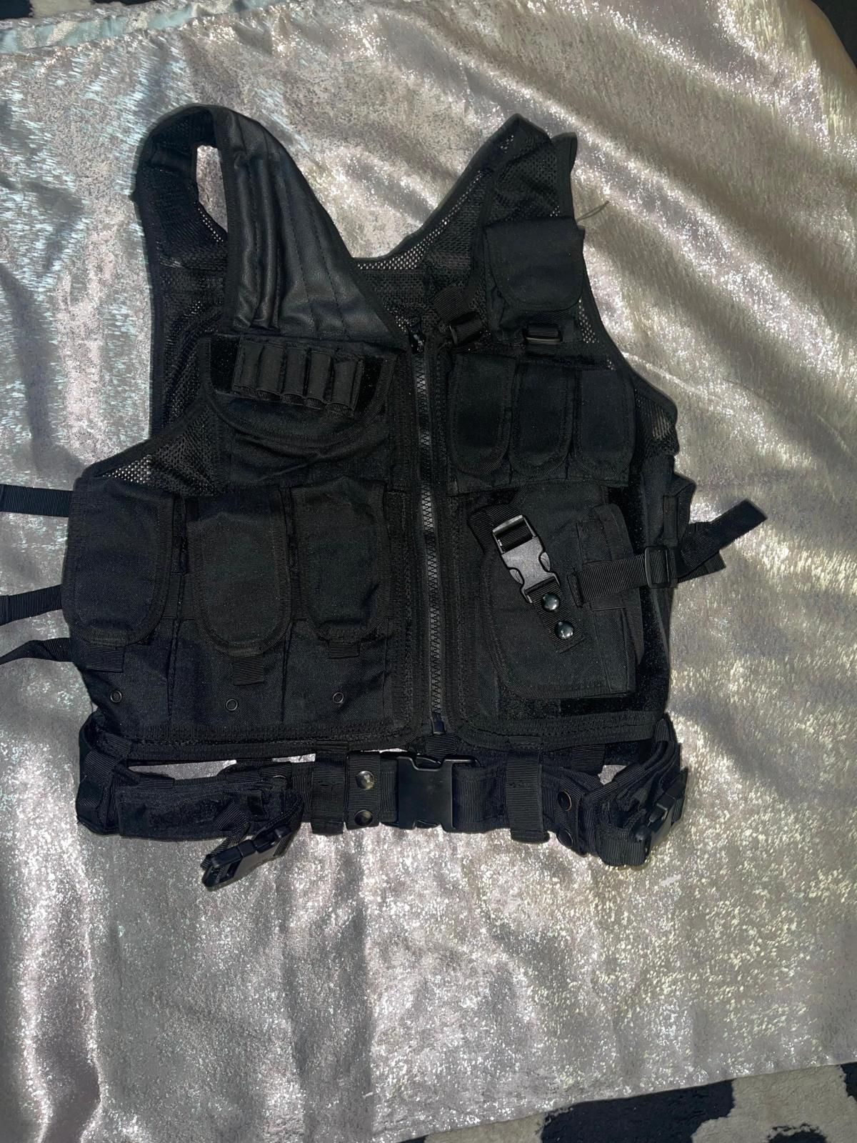 black tactical vest. It is designed for tactical and outdoor use, often seen in activities like airsoft, paintball, hunting, or training. These vests typically feature multiple pockets and pouches for carrying gear and accessories. Many tactical vests are made from durable materials like 600D polyester or nylon and include breathable mesh for comfort. They are often adjustable to fit various body sizes and may include features like MOLLE webbing for attaching additional equipment.