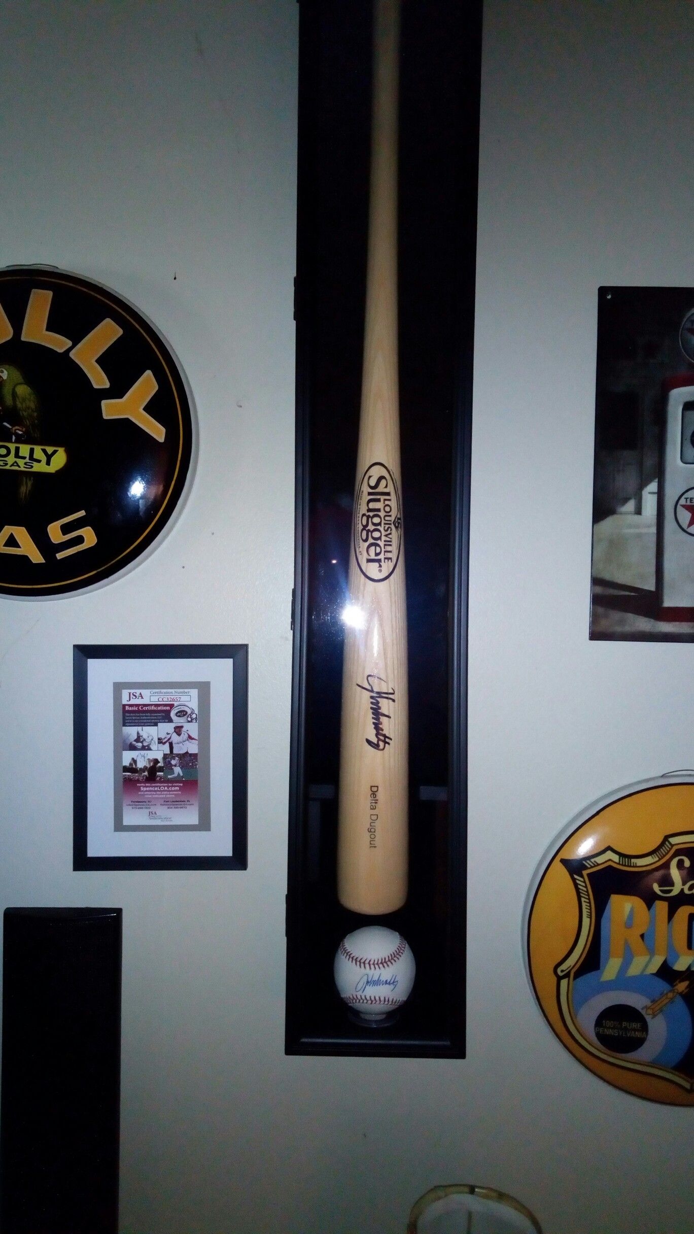 John smoltz sighned Louisville slugger and sighned baseball in display case with JSA certificate of authinticity