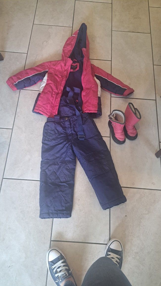 Used snow outfit. Girls size 4 and Girls boots size 8. No holes or tears.