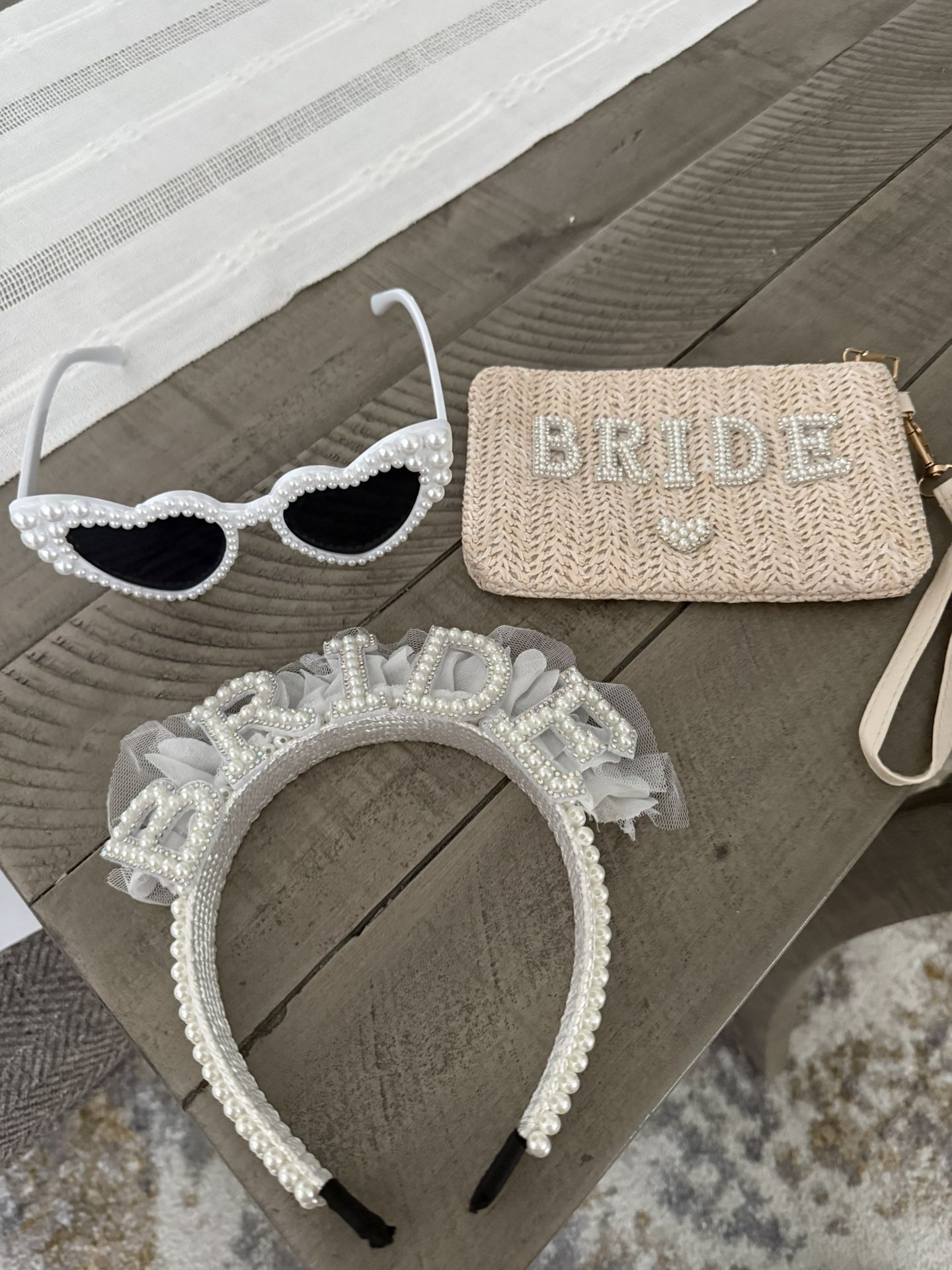 Maid of honor items all new 2 zipper bags $1.50 each 2 glass tumbler $5 each 2 travel jewelry box $5 each New Bachelorette items (upon request) 2 gold rose bracelets $1.00 each 1 bride clutch bag new $2.00 1 Bride glasses new $5 1 Bride head band used once like new $5 *More Bride items (upon request)