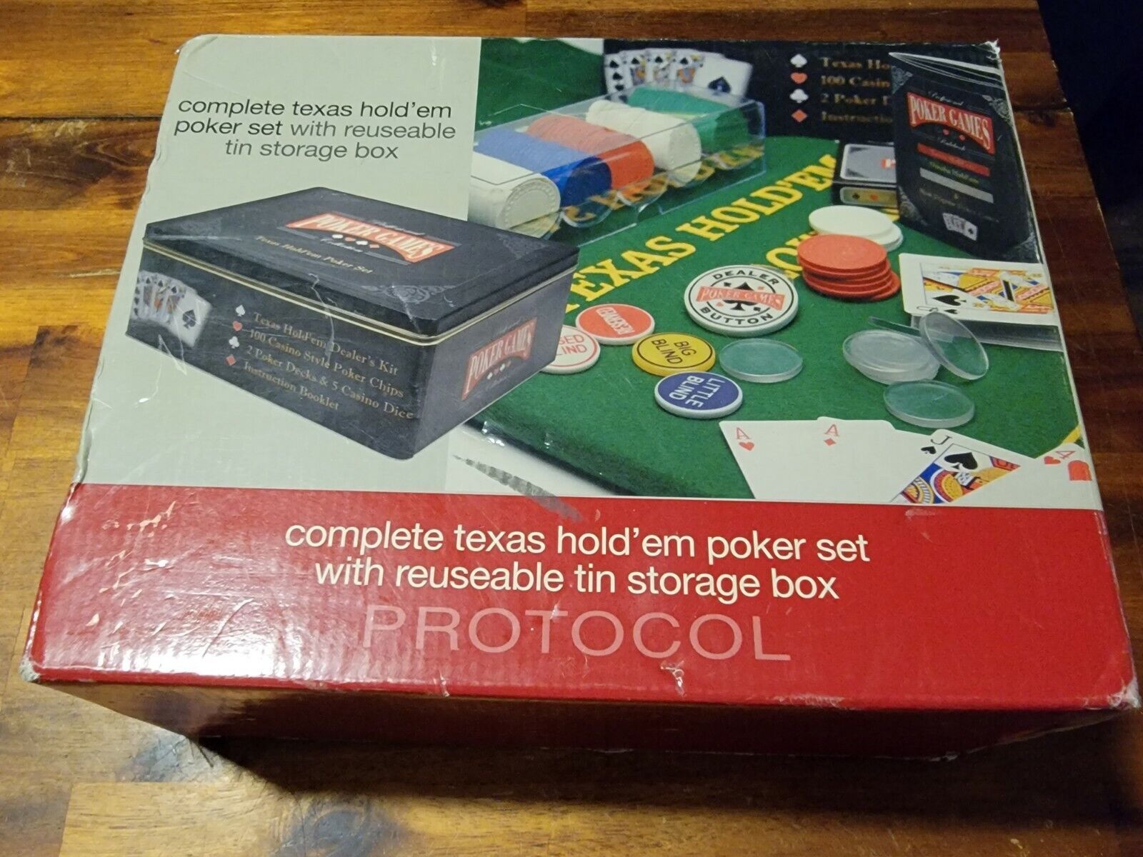 This is a new Protocol Complete Texas Hold ‘Em Poker Set. Still in the original box and unopened. Comes with reusable tin storage box. Includes large casino style green felt playing surface, 2 card decks, full set of 95 chips, complete dealer button set and texas hold ‘em rule book.