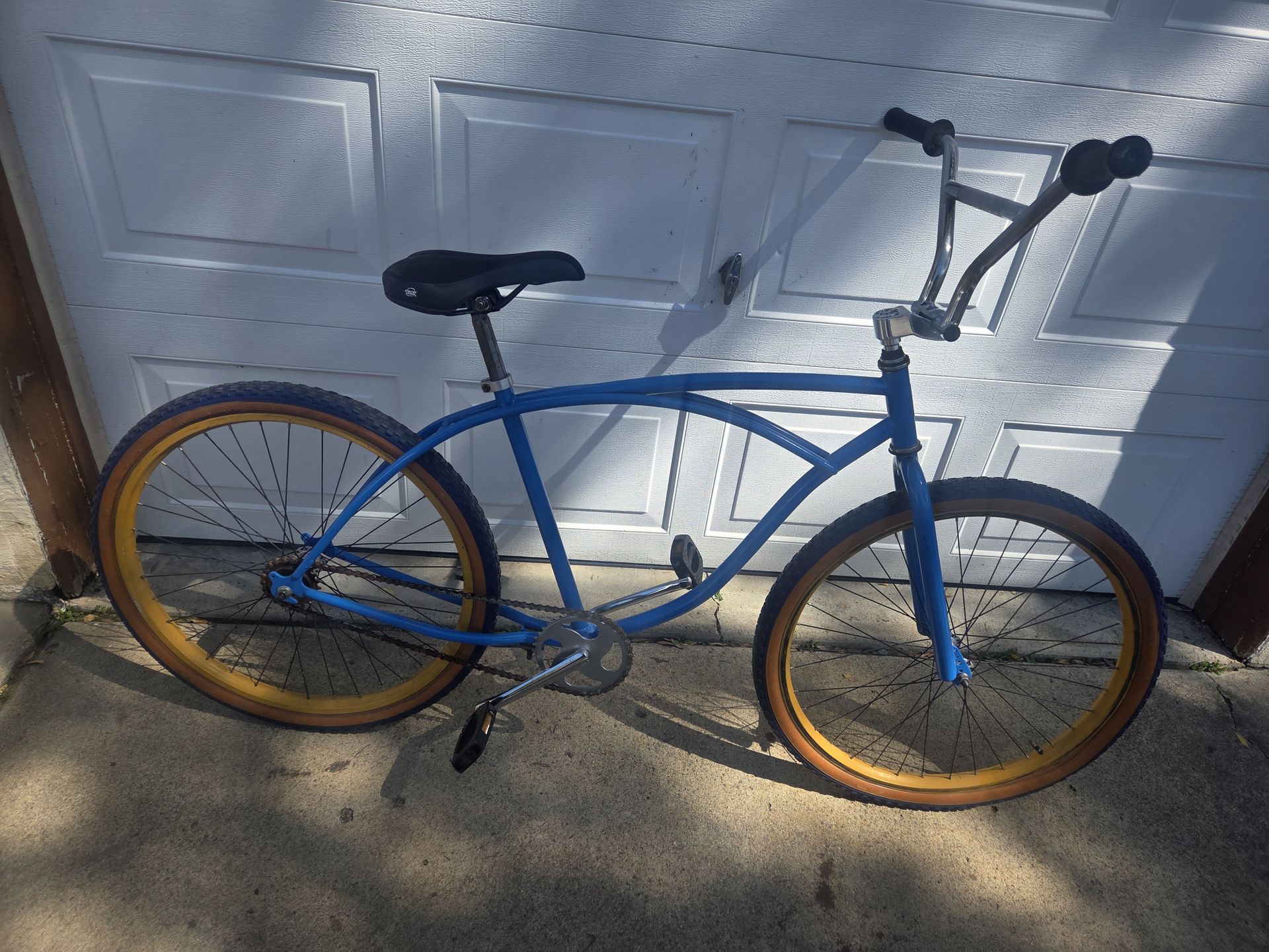 I have a nice 26 inch Klunker I am not sure of the name brand on frame. super solid bike great for warmer weather. look good on those bike rides along the board walk. old school freestyle bars nice parts on the bike. rad bike schwinn haro beach cruiser.