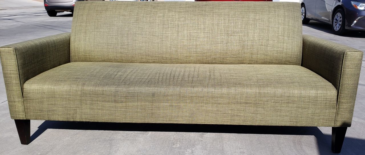 Mid century modern design sofa olive green color. Has some wear on the seat. Otherwise in great sturdy shape. L 75" H 35" Width/Depth 32"