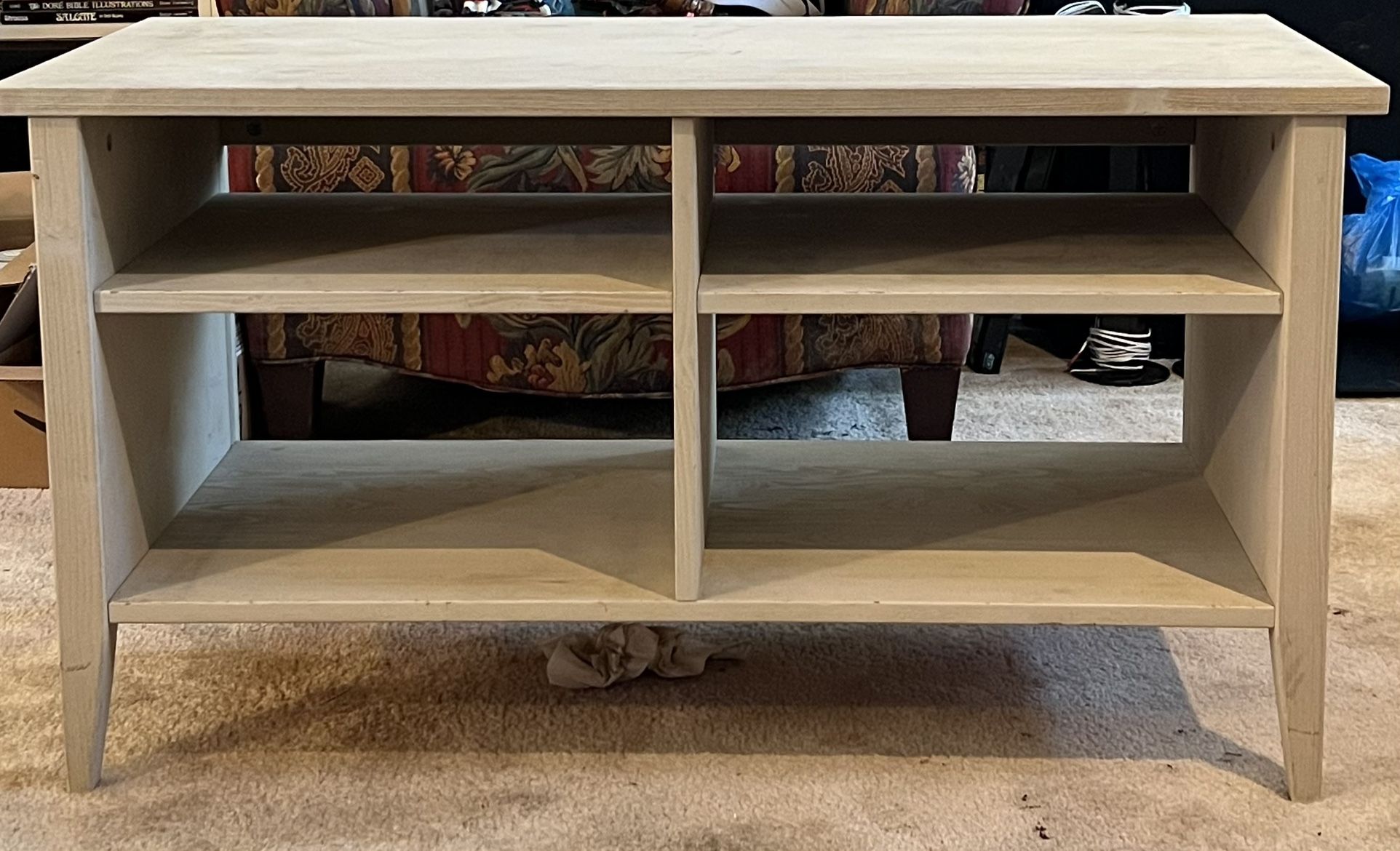 Faux wood entertainment measures approximately 19”(D) x 23”(H) x 44”(W). The interior shelves are approximately 18”(W) x 17”(D).