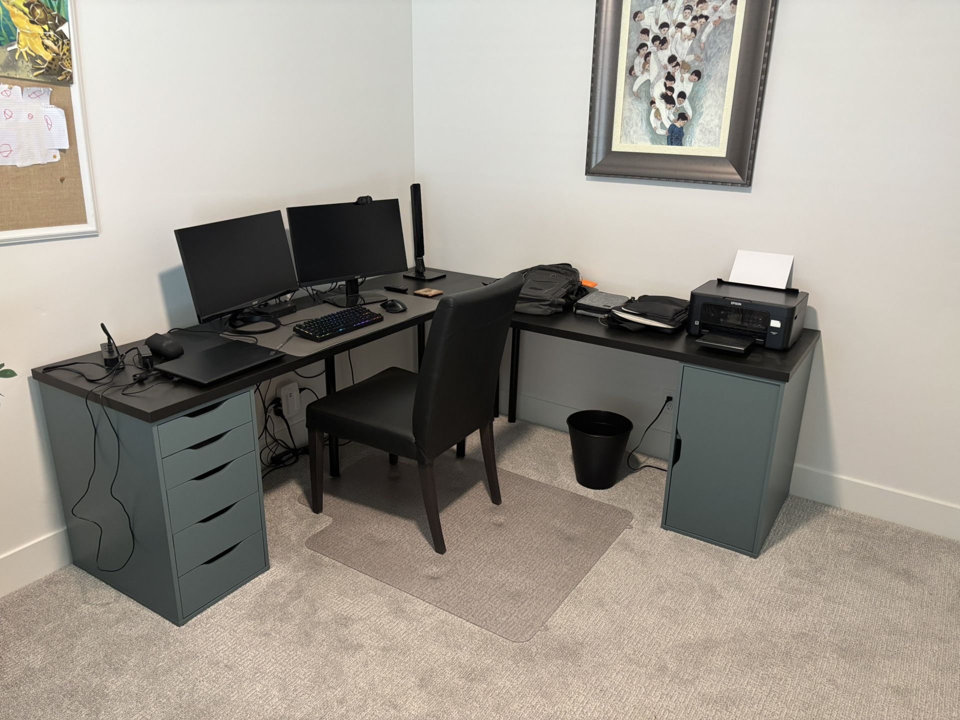 Corner desk, comprised of two desks that can be separated. 79”x79”x 24” deep. Desk 1: 79”x24”; Desk 2: 55”x24”. Chair and floor mat included. Like new condition.