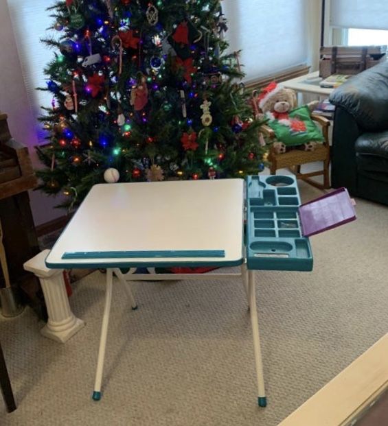 Foldable at table. Kids height, with nice sized work are. Side tray for supplies, etc.