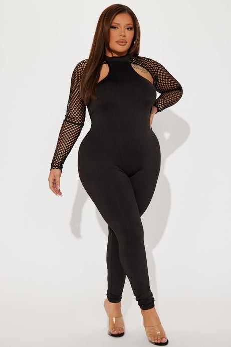 Fashion Nova Black Fishnet Sleeve Jumpsuit