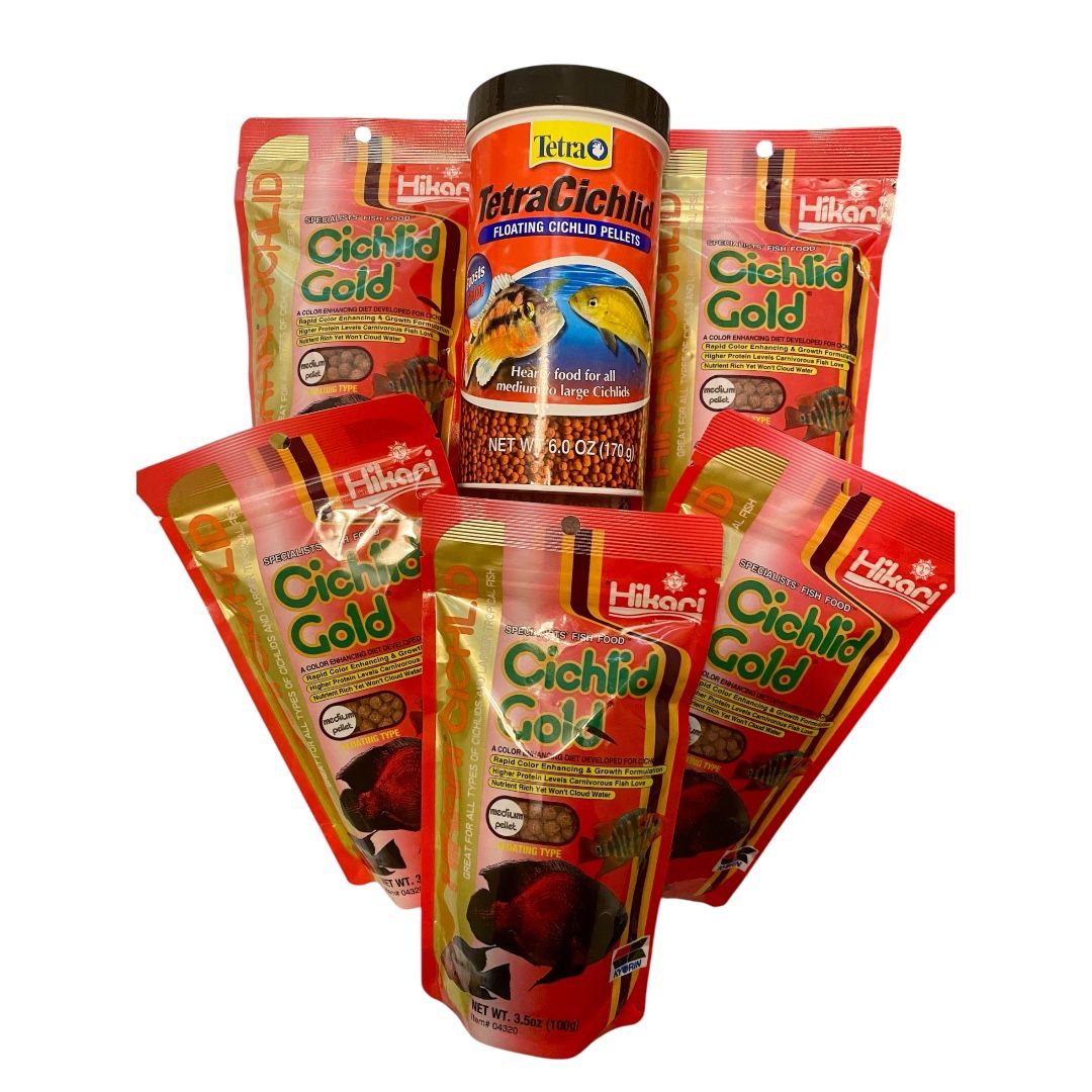 (5) Hikari Cichlid Gold Medium Pellet 3.5 oz. & (1) Tetra Small Pellet Floating 6 oz. Fish Food
