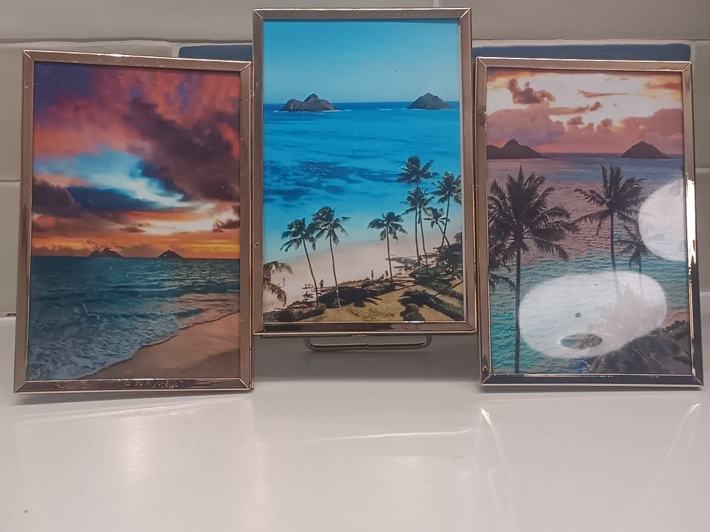 Selling an Isaac Jacobs tri-fold picture frame! It has a gold finish and holds three photos. There is a scratch on one of the frames and the metal is slightly bent on another, as shown in the photos.