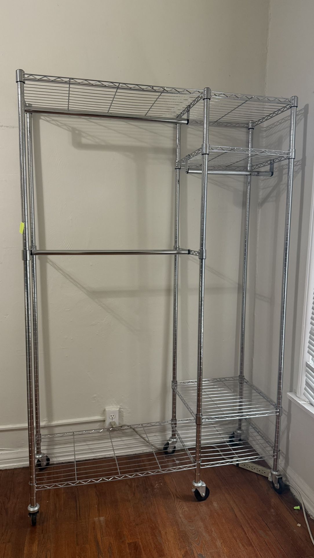 Sturdy rolling closet system with double hanging rods and multiple shelves. Great for adding instant storage without installing anything. Perfect for: • Apartment closet overflow • Moving / temporary wardrobe setup • Organizing outfits, shoes, and accessories • Retail or wardrobe use Features: • Two hanging bars (great for separating items or maximizing space) • Multiple wire shelves for shoes, bins, or folded clothes • Smooth-rolling wheels (easy to move, even when loaded) • Durable chrome metal construction — holds a lot Fully assembled (47”W x 17.7”D x ~80”H)
