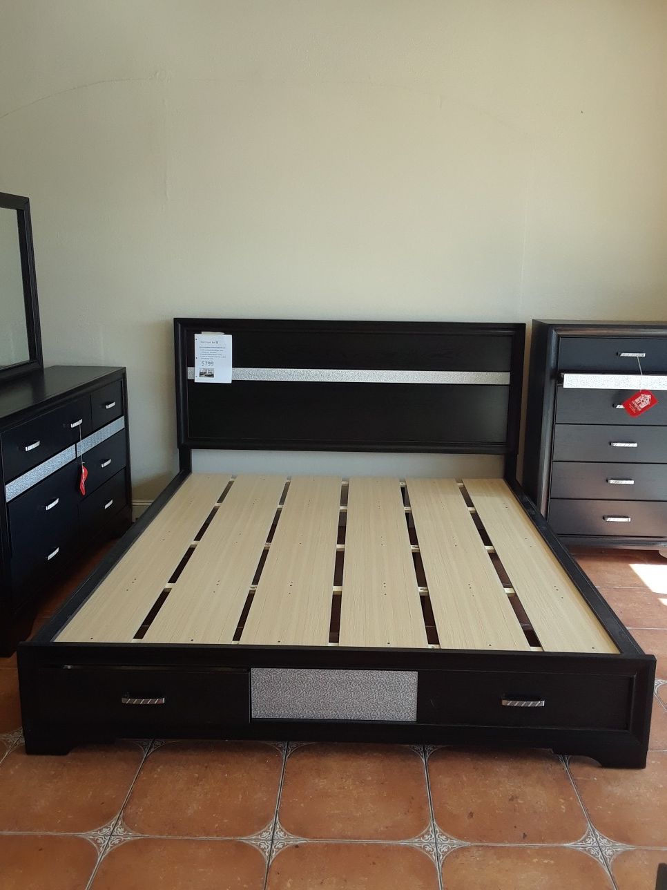 Storage platform bed frame has two drawers on the footboard Chest of drawer is available and sold separately for more Super fast delivery is available for this