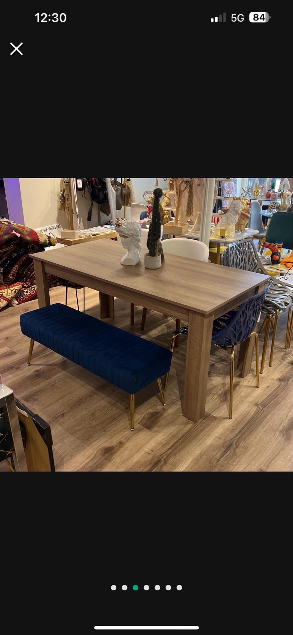 Brand New, in the box. Assembly required. - Gray oak wooden table - 6 people seat - Perfect for big families - Sturdy rectangular kitchen table - Farmhouse, Midcentury Modern style Price: Table - $250 Bench - $120 Chairs - $50 each PICK - OTTOMAN BENCH and or CHAIRS (pick seat color: white, black , gray, pink, navy, yellow | pick legs color: gold, silver ) Table Dimension 63” x 32” x 30” (W x D x H) Ottoman Bench Dimension: 45” You can pick up or delivery is available for extra fee.