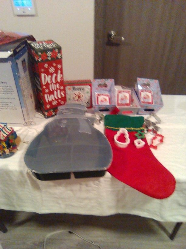 5 gift trays snowman cookie tray one wine box , 1 small box and 1 sock.