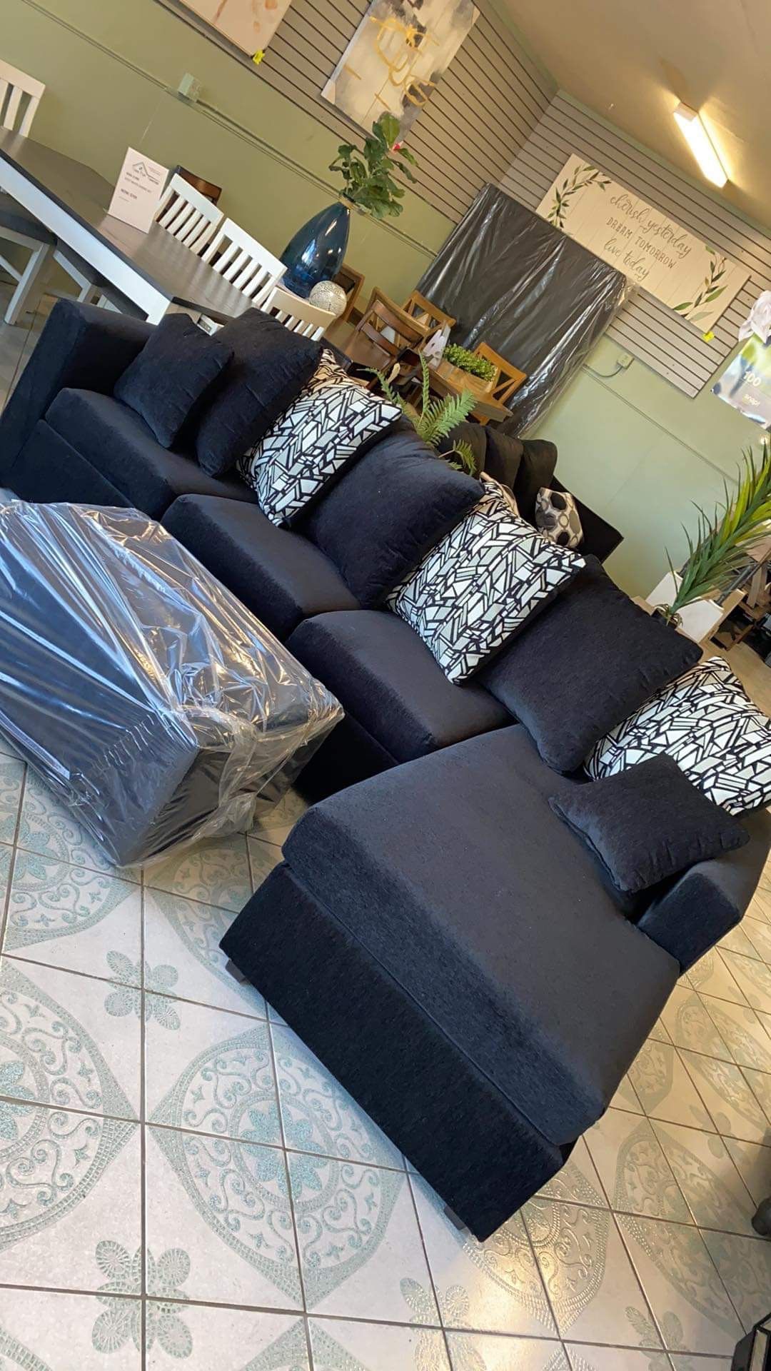 Black sectional with designed pillows¡¡NEW!! Take it home with only ‼️$39 down ‼️j 100 days same as cash no interest Come pick up or ask for delivery 🚚 Completamente nuevos Ven por el o pregunta por tu entrega 🚚
