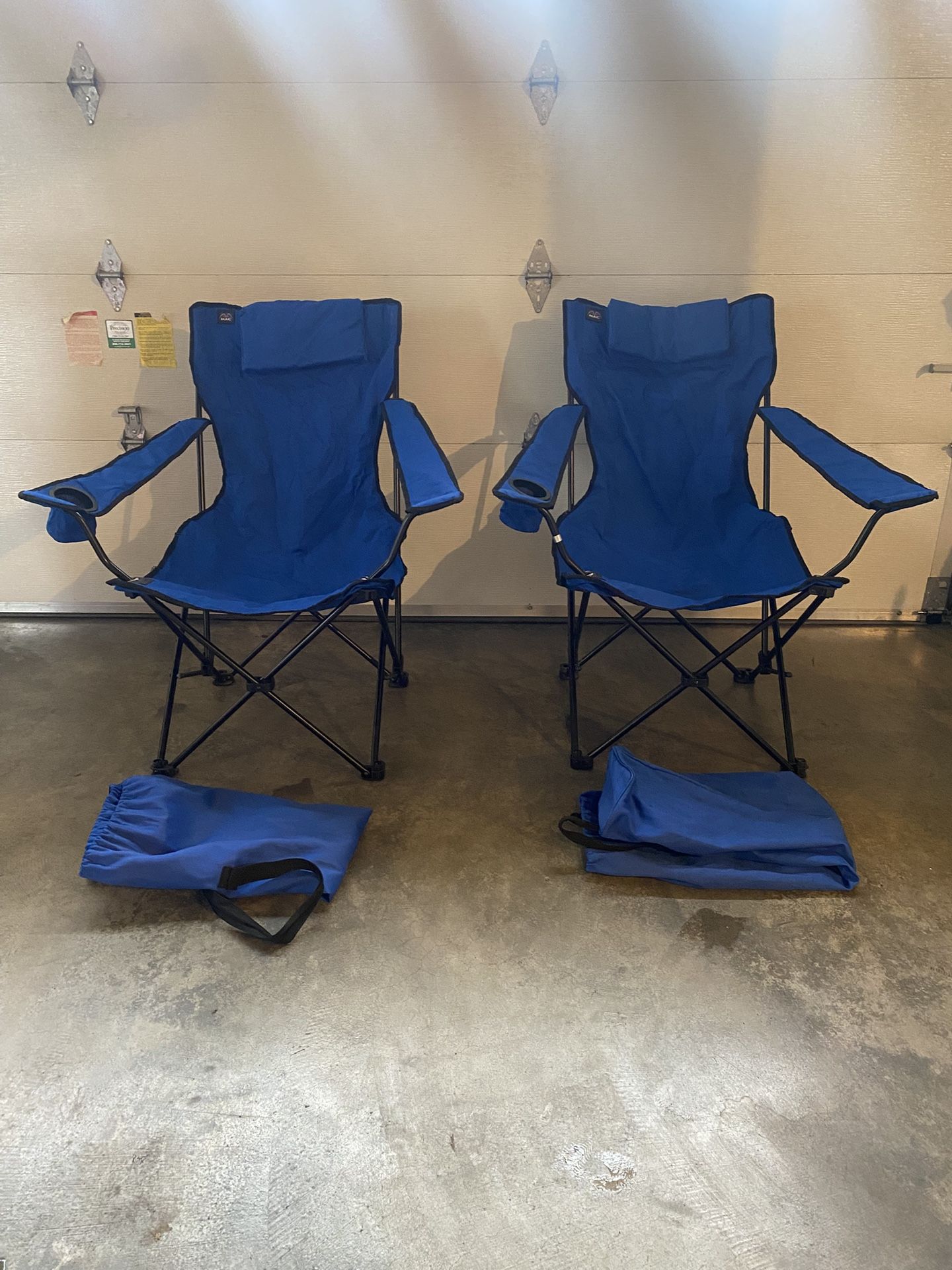 Two folding chairs Removable headrest Drink holder Heavy-duty steel frame and fabric Larger than a typical camping chair (see photo comparison) Travel bags included Blue Great condition