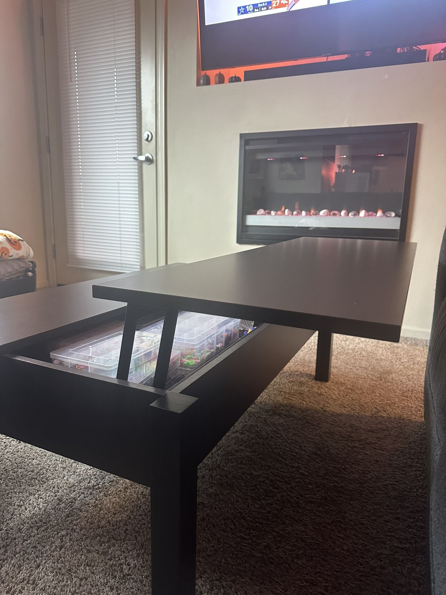 Dark brown lift top coffee table. Fantastic shape, soft close top with storage underneath the top as well. Storage extends the entirety of the table, not just under the portion that lifts up. 45.25” L x 27.5” W x 16” H Extendable portion 15.25” Width 6.5” Lift