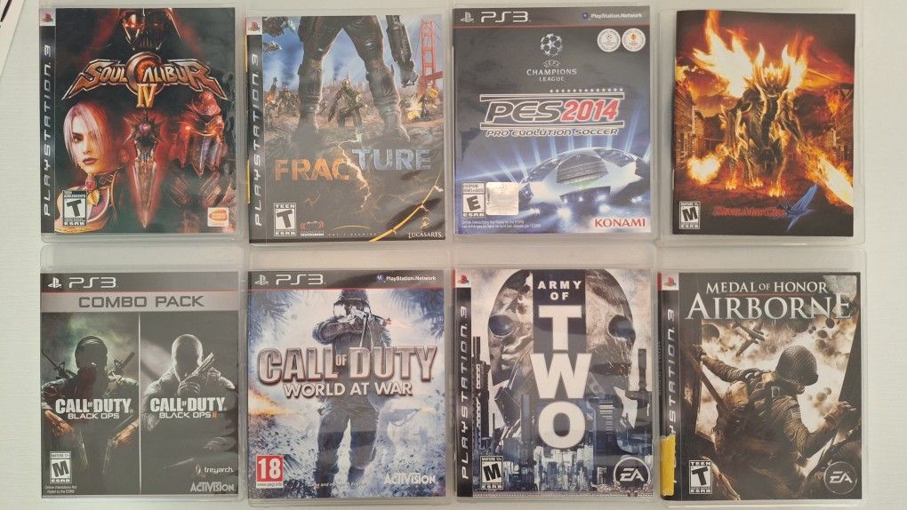 Call of Duty Black Ops I/II Combo $20 Call of Duty World At War $15 Soul Calibur IV $15 Devil May Cry 4 $15 Medal of Honor Airborne $20 Army of Two $20 Pro Evolution Soccer 2014 $15 Fracture $15 Or take the whole lot for $85 I also have an original fat BACKWARDS COMPATIBLE ps3 that works for a few minutes but overheats and shuts off. Great for a rebuild or for parts. Make me an offer, and it's yours.