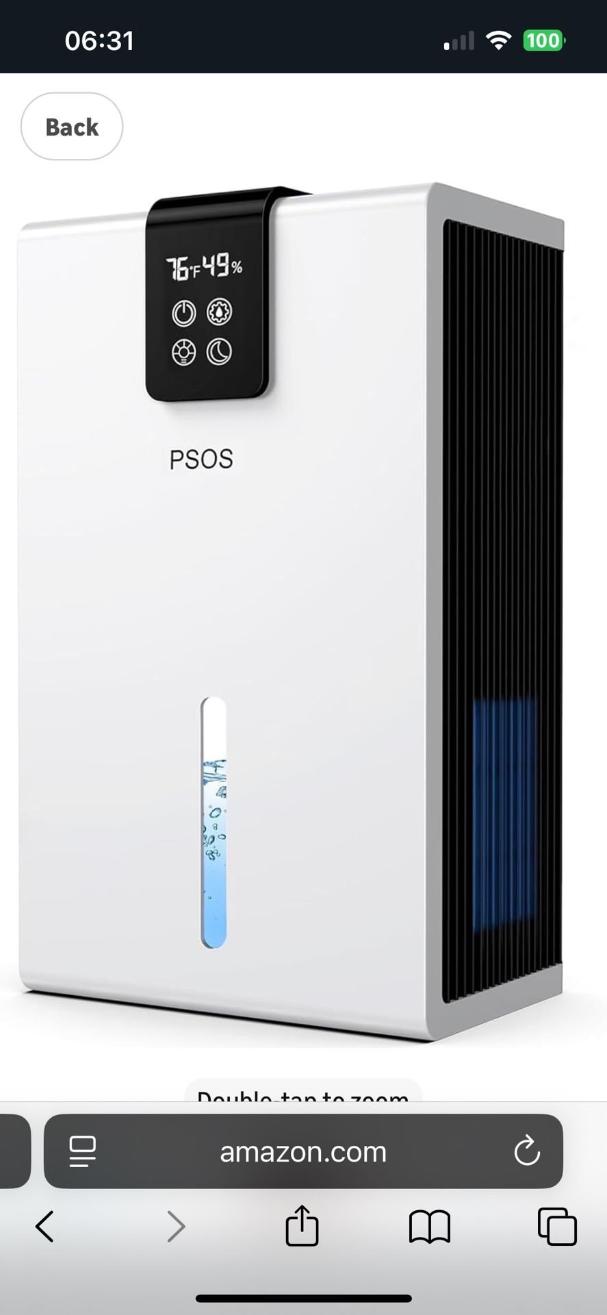 Brand PSOS Floor Area 1000 Square Feet Color White Special Feature 40 Pt Max Moisture Removal, 1,000 Sq. Ft. Coverage, Auto Shutoff, Quiet Operation, Auto Defrost, Moisture Removal, Detachable Design, Bucket Storage, Digital Display, Ergonomic Handle, Removable Tank, Portable Design, LED Indicator, 7-Color LED Night Light, Enhanced Comfort40 Pt Max Moisture Removal, 1,000 Sq. Ft. Coverage, Auto Shutoff, Quiet Operation, Auto Defrost, Moisture Re… See more Capacity 6.1 Pounds Tank Volume 98 Fluid Ounces 【Dual-Action Dehumidifier & 24/7 Moisture Control】Combat excess moisture with this ultra-quiet dehumidifier for home use, featuring advanced dual-core semiconductor technology,extracting up to 40 oz/day (tested at 86°F, 80% RH) with advanced dual semiconductor technology. The portable and detachable large-capacity water tank reduces frequent emptying, making it a powerhouse for your basement,bathroom,bedroom,closet, or even compact RV.For best results, close all doors and windows during use 【Smart Touch & Multi-Mode Precision Control】This dehumidifiers for home features an LCD display that helps you monitor the ambient humidity and the internal temperature of the machine. Simple to operate, just tap the button to select the mode that suits your needs and easily maintain the optimal humidity level.Equipped with high-accuracy humidity sensors and an intelligent chip, it offers two working modes: A strong mode that quickly controls humidity. Low-speed sleep mode creates a light-free environment and keeps it quiet while you slee 【Auto Shut-Off & 7-Color LED Night Light】This dehumidifier for basement features an automatic shut-off function. When the water tank is full or the unit is improperly placed, the dehumidifier will illuminate a red light and automatically shut off to prevent overflow.The dehumidifier for bedroom comes in 7 different colors that are constantly changing. You can choose a color you like and lock it, which can be used as a night light for convenient nighttime use.A unique quiet design for quiet operation (< 30 dB) while you sleep. 【Auto Defrost System & Energy Smart】Our dehumidifier for bedroom operate smoothly even at low temperatures of 41°F (5°C). The automatic defrosting system senses temperature drops and prevents frost buildup on the condenser coils, allowing you to enjoy a worry-free home life even in humid or cold seasons. The intelligent power management system adjusts performance based on humidity levels, saving up to 20% on energy while maintaining a comfortable temperature 【Portable & Easy Mobility】Our dehumidifier for bathroom combines function and flexibility, with hidden side handles for easy movement between rooms.Its durable ABS shell resists scratches, and the slim design fits neatly in bathrooms, basements, closets, RVs, or even as a stylish addition to your living room.Its modern aesthetics and space-saving footprint make it the perfect dehumidification solution for every corner of your home