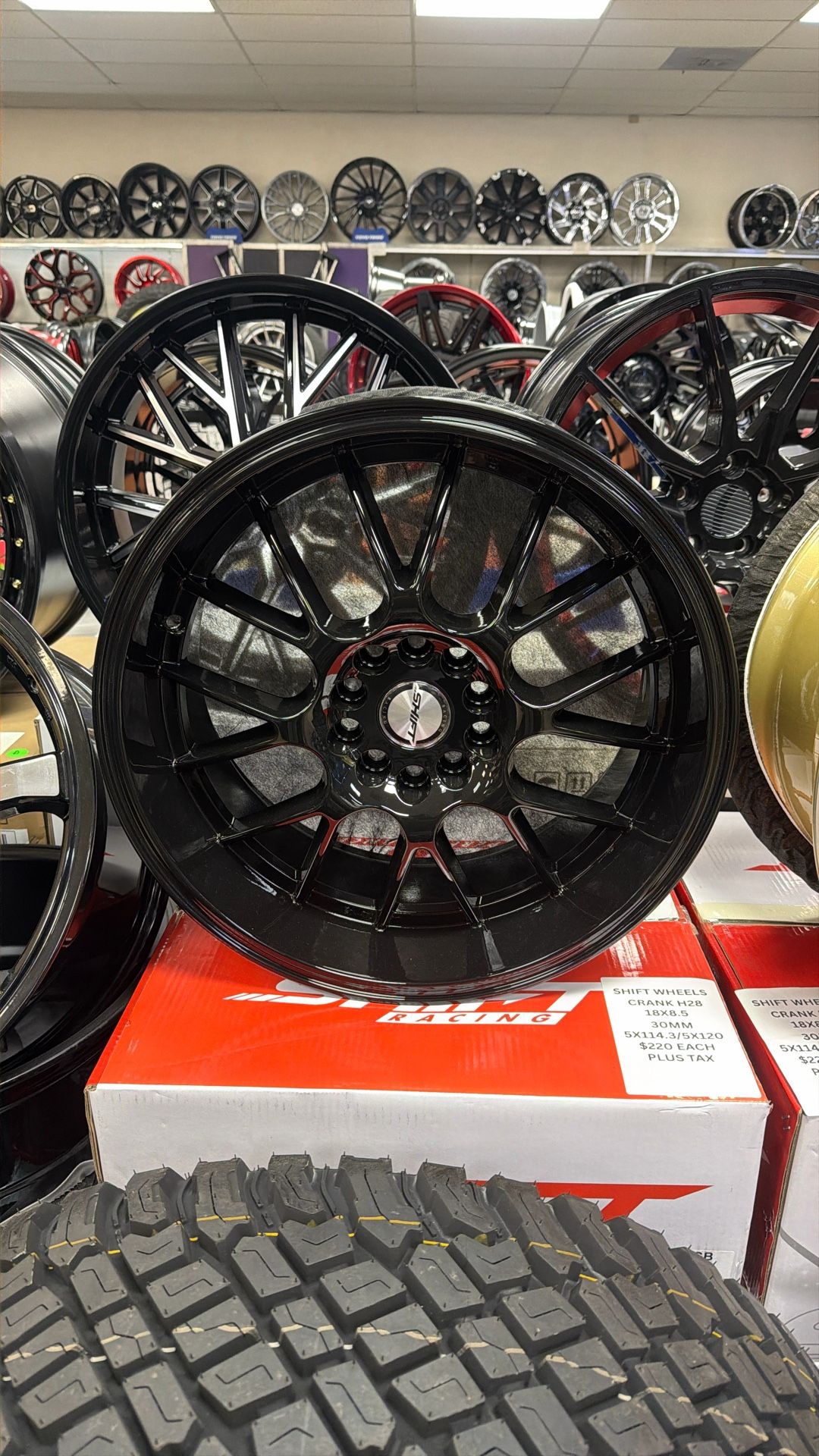 BRAND NEW WHEELS SHIFT CRANK All Gloss Black 18x8.5 +30 5x114.3 and 5x120 $1,000 For set the plus tax Tires are available if needed 702-450-9940 2770 E Flamingo Rd