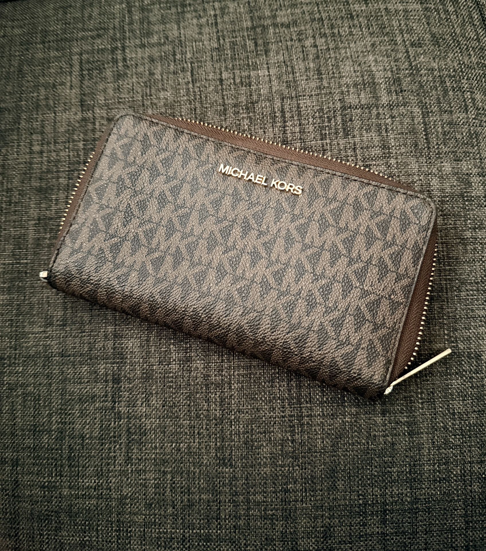 Michael Kors wallet with a zip closure. Features a signature pattern.