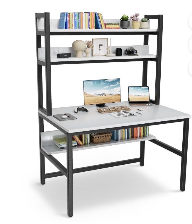 Aquzee Hutch Desk 2 tier shelves above and 1 under shelf. Great for home or office for space saving desk. Grey / Black Already assembled.