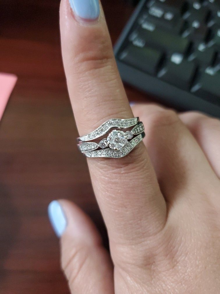 14k white gold diamond engagement ring and guard Engagement ring has cluster of 7 diamonds, center stone measures approx 2.2mm. Next to cluster on either side approx 2.1mm, next are 4 stones on either side 2) 2mm, 2) 1.8mm, 2) 1.3mm and 2) 1mm. These have a milgrain edge around them Guard has 22 diamonds 2) 1.8mm and 20 approx 1.2mm. Average clarity if all stones is S12-S13, and range from H to I in color.