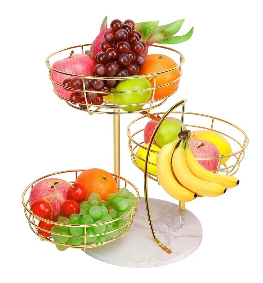 Fruit Basket Bowl with Banana Hanger, Metal Fruit Vegetable Storage Basket with Banana Holder for Kitchen Counter, Detachable Organizer for Bread Snack Produce (Gold, 3-Tier Marble Base)