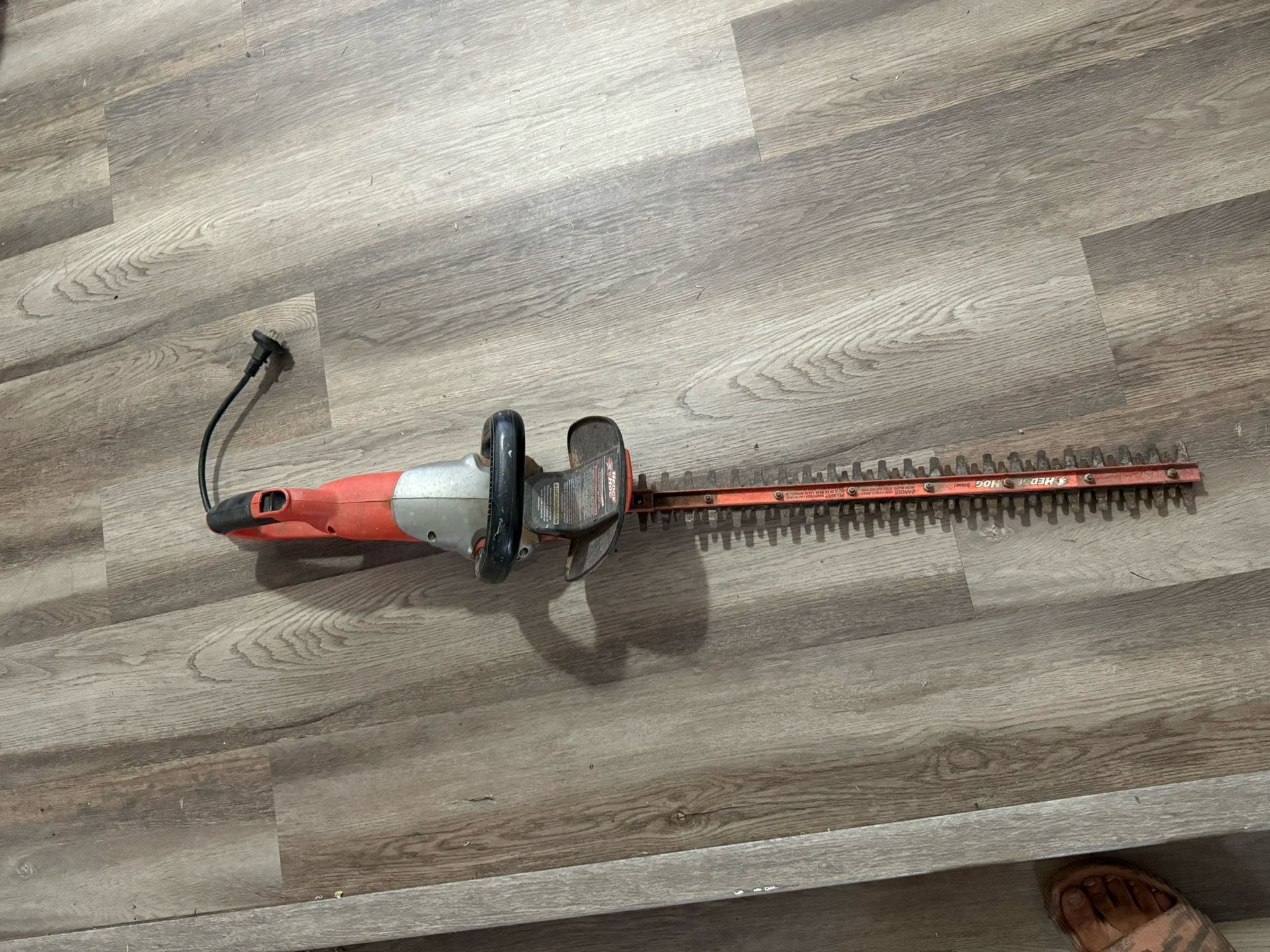Works great powerful and reliable electric hedge trimmer by Black+Decker (Hedge Hog model). Perfect for trimming bushes, hedges, and small branches around your yard. (PICK UP ONLY) 24-inch dual-action blade • Corded electric (plug-in) • Lightweight and easy to handle • Used but in good working condition $35 OBO
