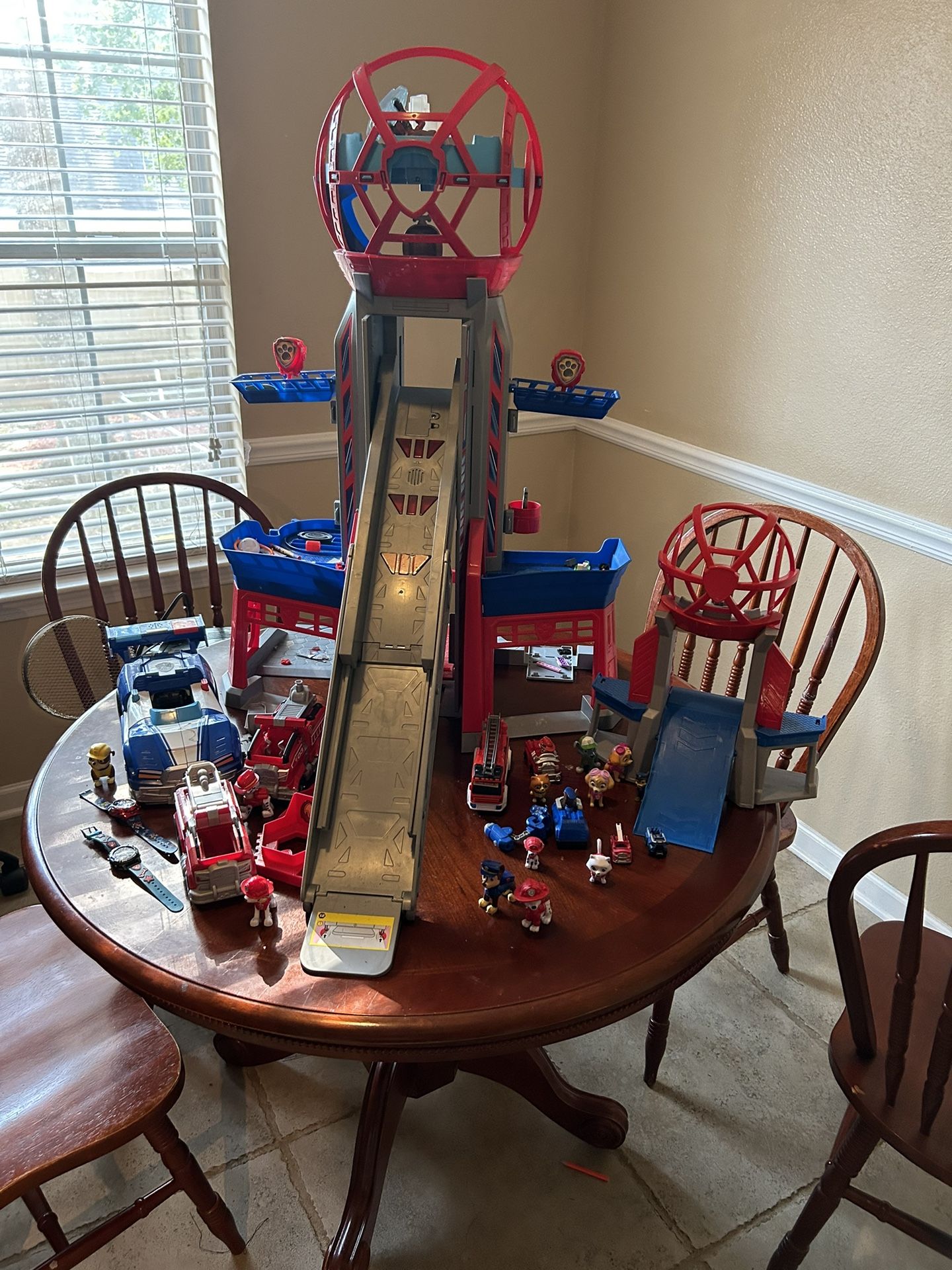 Paw patrol toys and canvas paintings lamp and overnight bag was bought during Christmas of last year son played with it for 2 months and said he doesn’t like paw patrol anymore it’s for lil kids so everything was put in the closet just made up my mind to sell everything for space but $150 for everything tower was over $100 by itself paintings about $60 action figures and cars and trucks about $40 small tower like $20 lamp $25 bag $15 so $150 is a great deal!