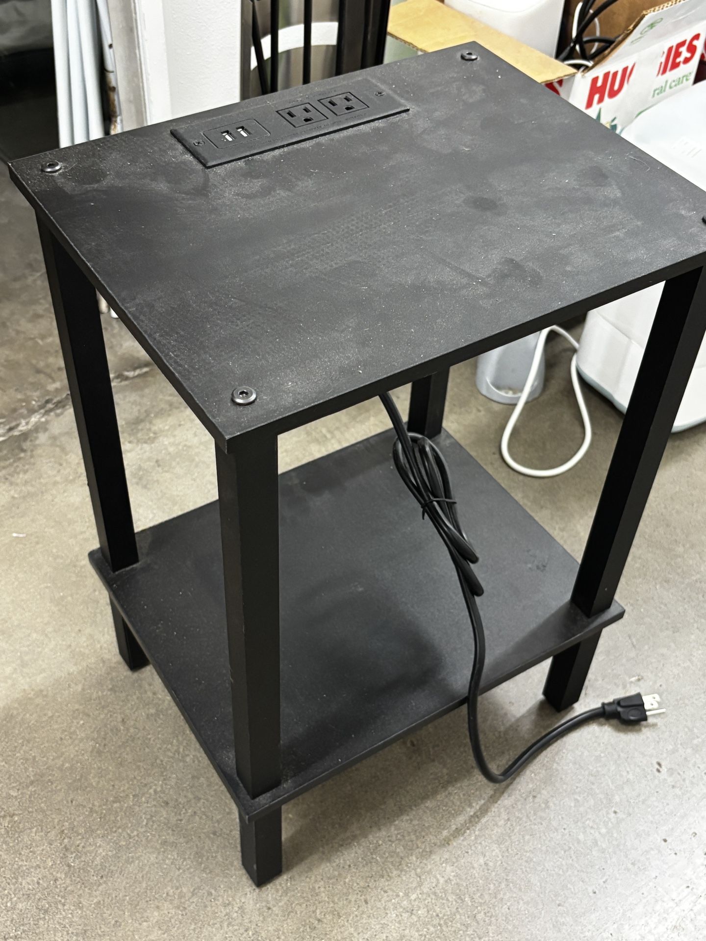 Functional and modern black side table with built-in charging station. Perfect for living rooms, bedrooms, or home offices. • 2 standard power outlets + 2 USB ports • Compact design with lower shelf for storage • Sturdy wood/metal frame • Great for lamps, laptops, or phone charging next to the couch or bed