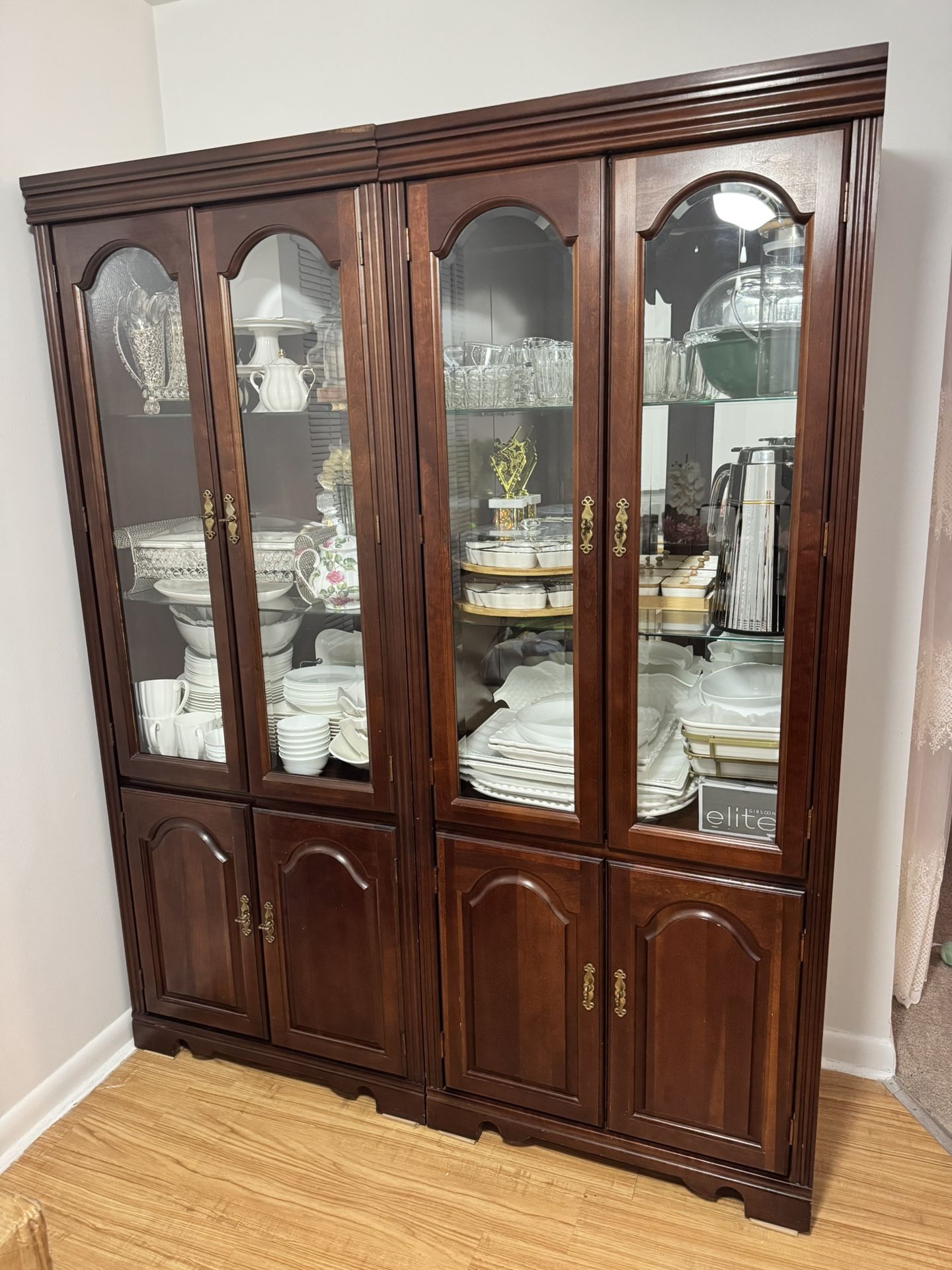 Two Solid Wood China Cabinet – $140 Elegant, well‑built china cabinet with glass display doors and lower storage. Adjustable shelves, classic wood finish, and clean interior. Great for storing or displaying china, décor, or collectibles. Price: $140 Condition: used like new Pickup only.