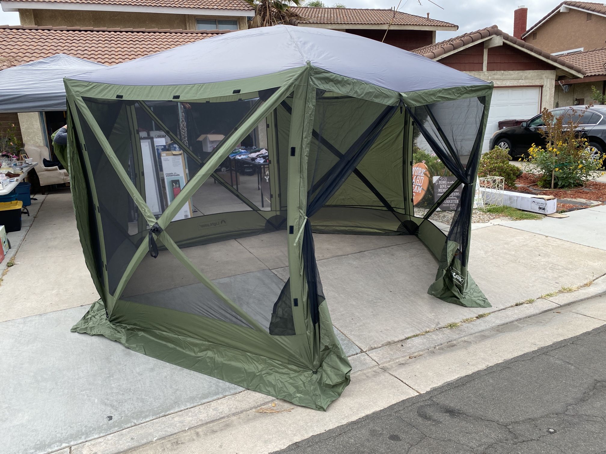 Condition: Used Great Condition Includes: Pack N Go Gazebo Zippered carry bag 7 heavy-duty plastic stakes 2 door support poles 5 guyline ropes, instructions Specifications: (3 min, 5 max): Roof and Side Walls: 210D polyoxford with 800 PU coating UPF 50+ Open dimension: 11.8 x 11.8 x 7 (ft) / 3.6 x 3.6 x 2.1 (m) Weight: 31.3 (lb) / 14.4 (kg)
