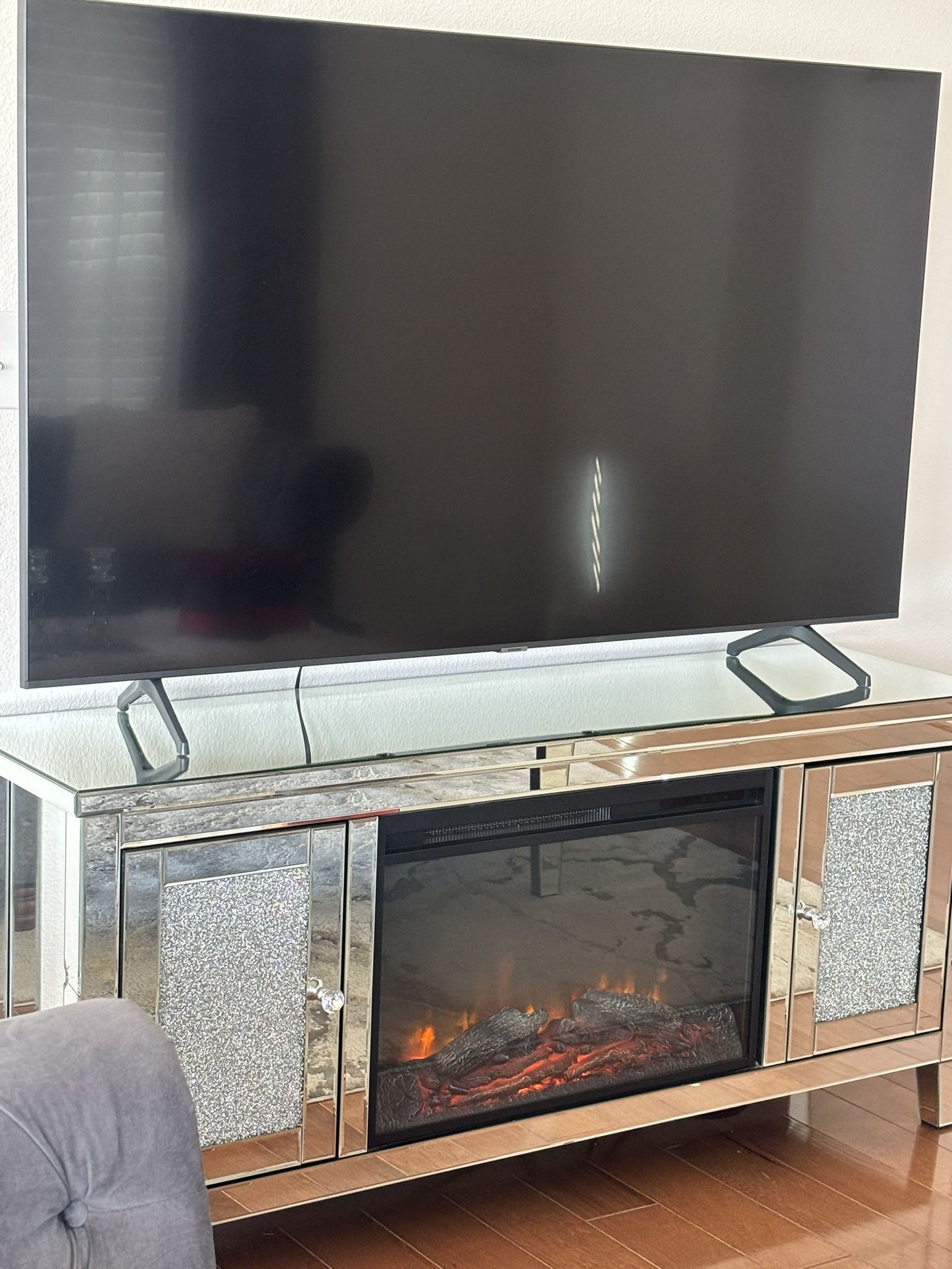 Modern fireplace TV stand in good condition. Features a sleek mirrored design with built-in electric fireplace that works perfectly and adds a cozy touch. Plenty of storage space for media and decor. There is a small crack on one corner (shown in photos), but it does not affect the stability or functionality. Still looks great overall and is priced accordingly. Perfect for anyone looking for a stylish TV stand at a great deal!